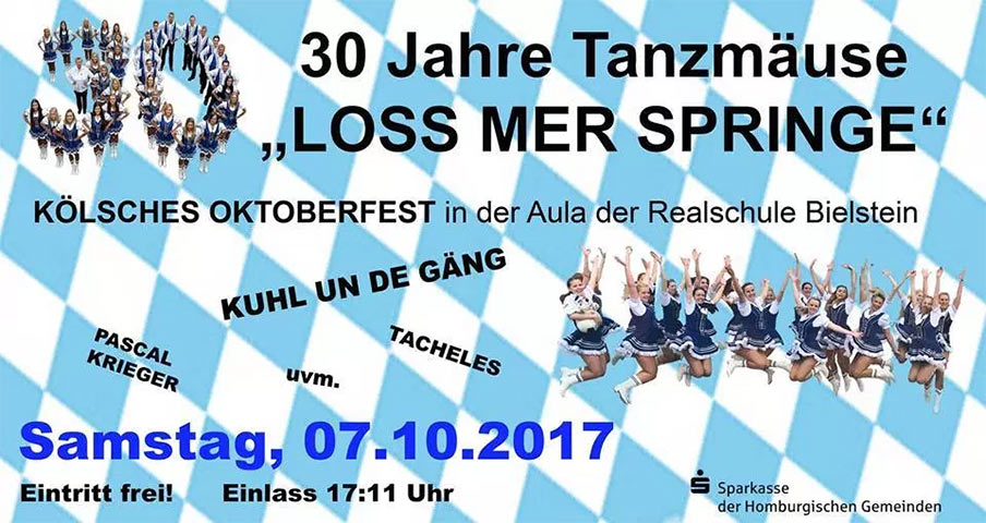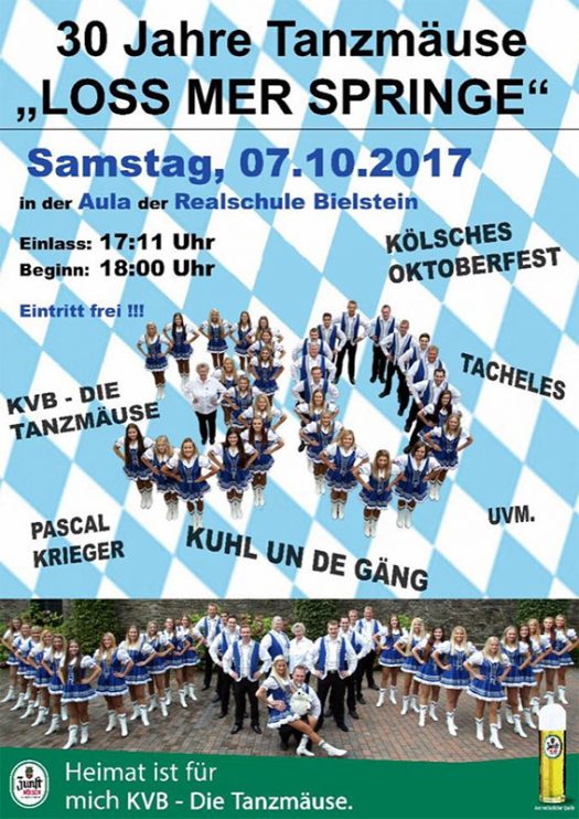 Aus diesem besonderen Anlass heraus veranstalten die Bielsteiner Tanzmäuse in diesem Jahr ein besonderes Event: Sie richten ein „Kölsches Oktoberfest“ aus, um das 30-jährige Bestehen der Tanzgruppe mit allen benachbarten Karnevalsvereinen, ehemaligen Tänzerinnen und Tänzern, sowie Freunden, Familien und Bekannten zu feiern. Die Dirndl und Lederhosen können endlich wieder aus dem Schrank geholt werden und kommen auch mal im Oberbergischen Kreis zum Einsatz. Denn das was die Münchner können, können die Bielsteiner allemal.