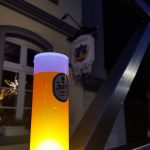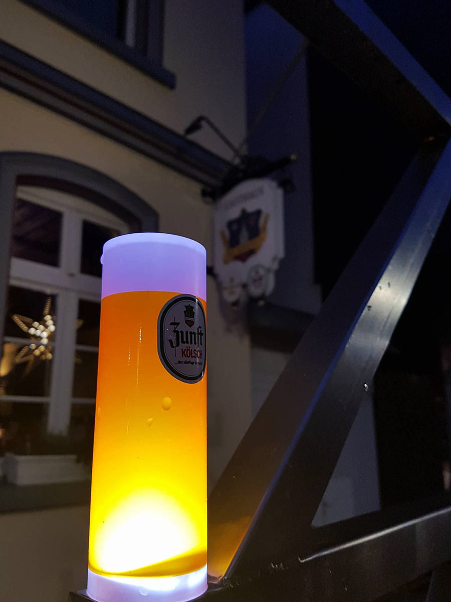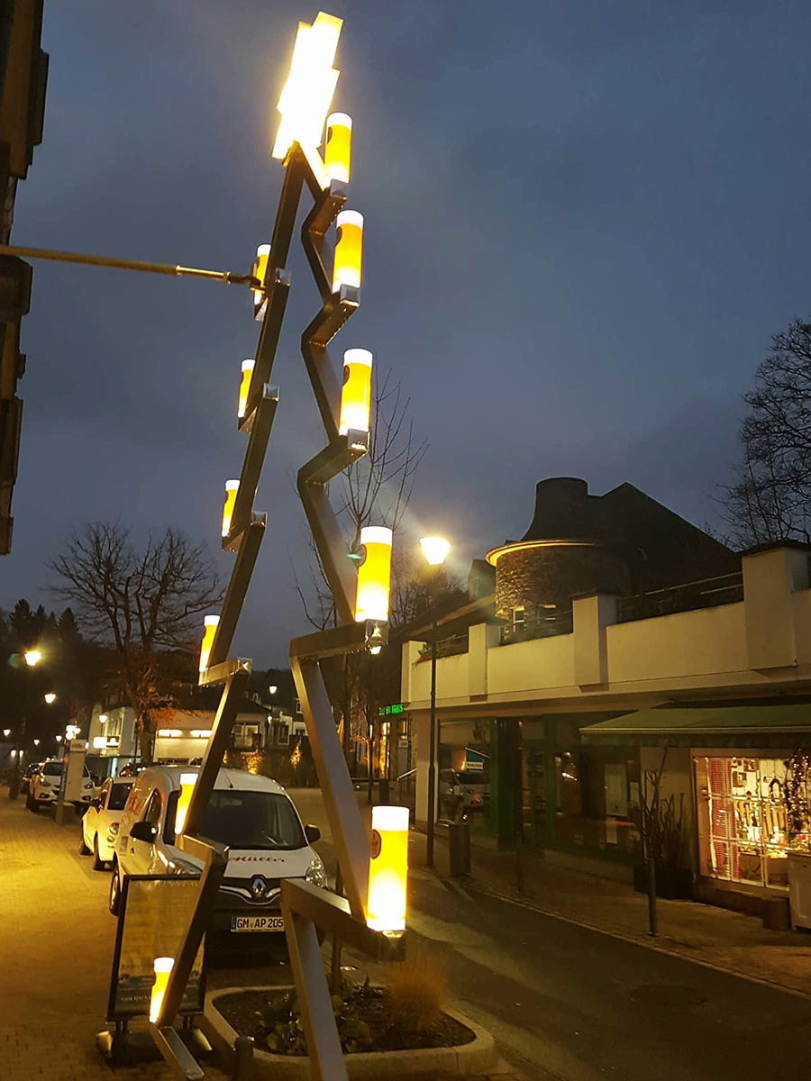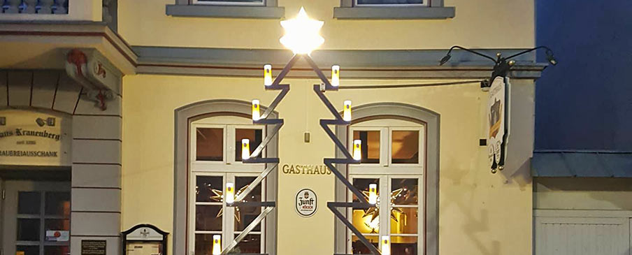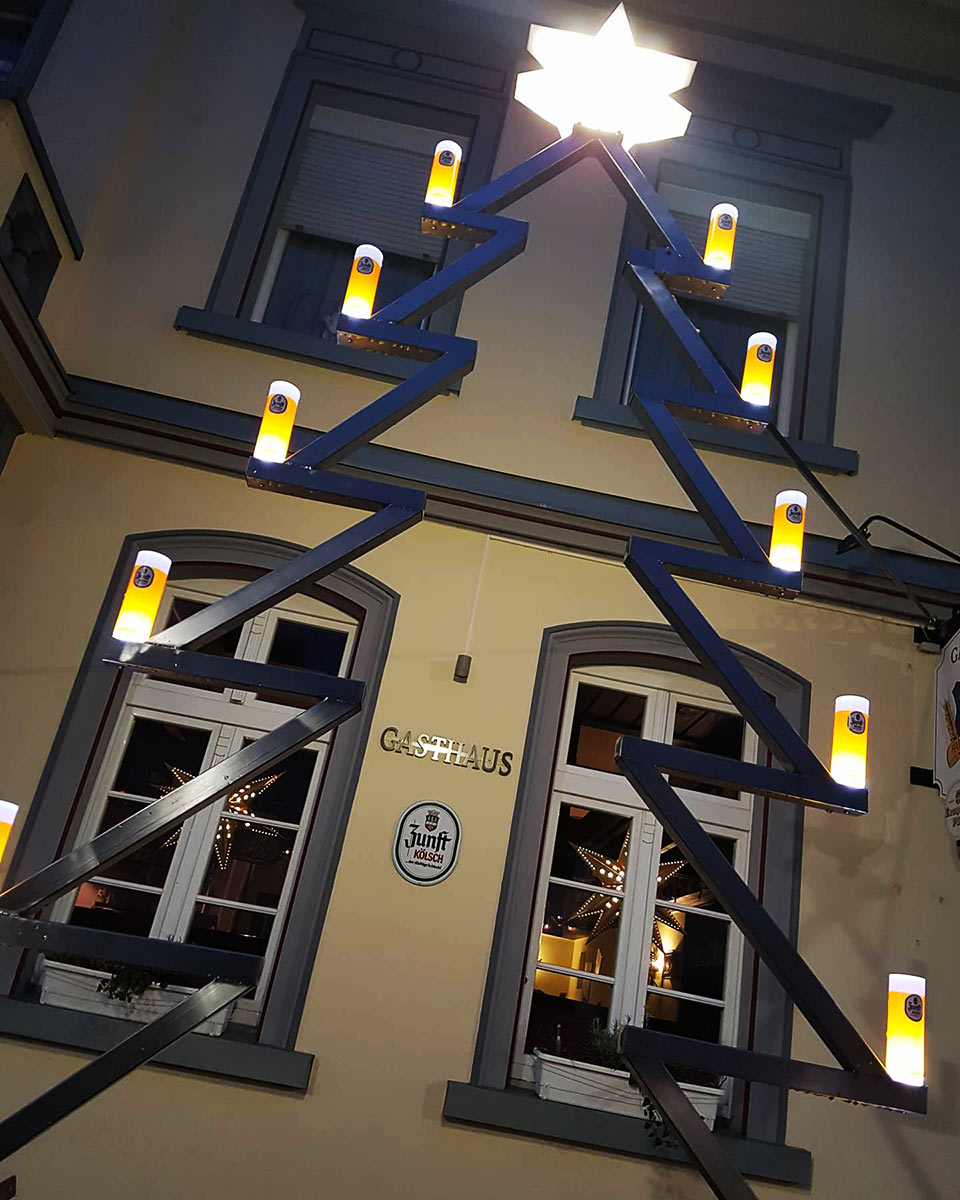 Bis Ende Dezember steht der Stahl-Tannenbaum mit den illuminierten Kölschgläsern nun vor dem Haus Kranenberg und ist gerade Abends im beleuchtetem Zustand ein schönes Highlight in der Ortsmitte.