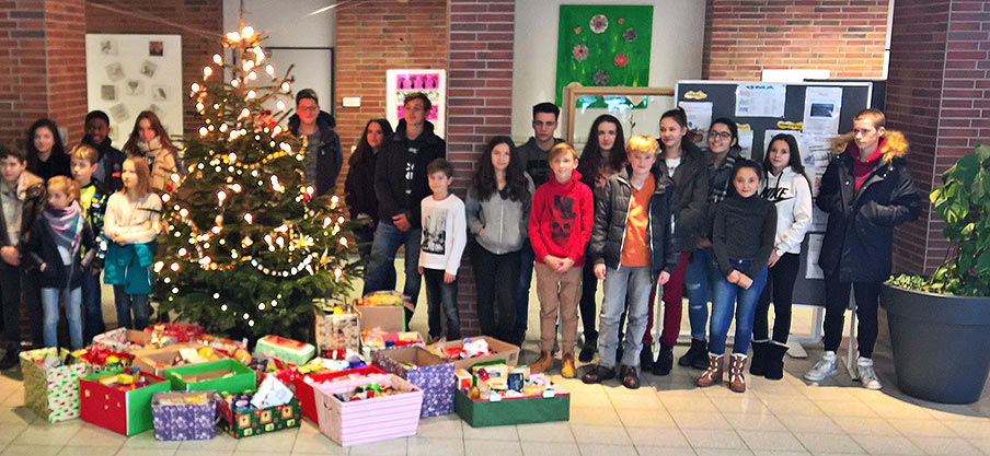 Jede Klasse sammelte die Spenden in einem weihnachtlich dekorierten Paket, welches anschließend mit einer schönen Karte versehen an die Mitarbeiter der Tafel übergeben wurde.