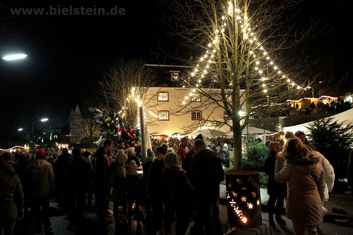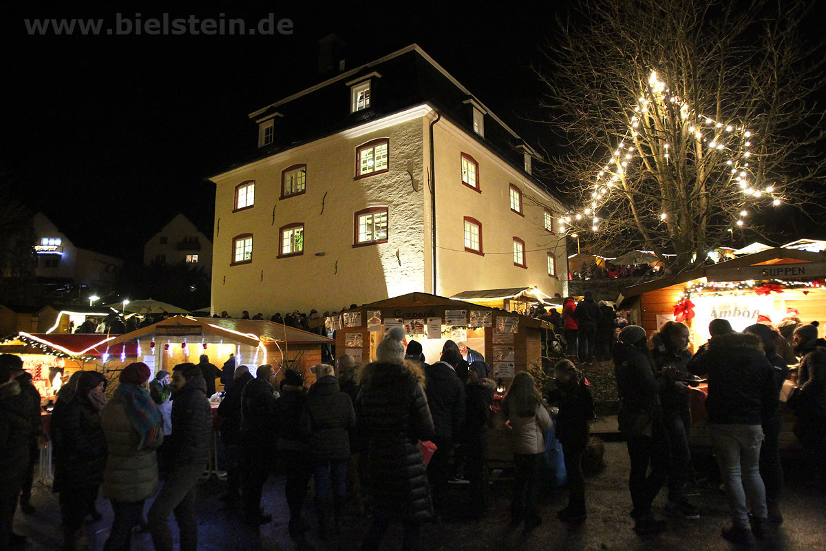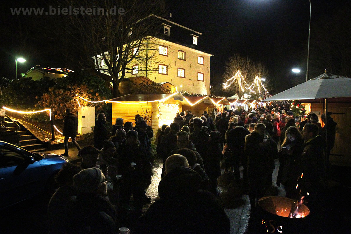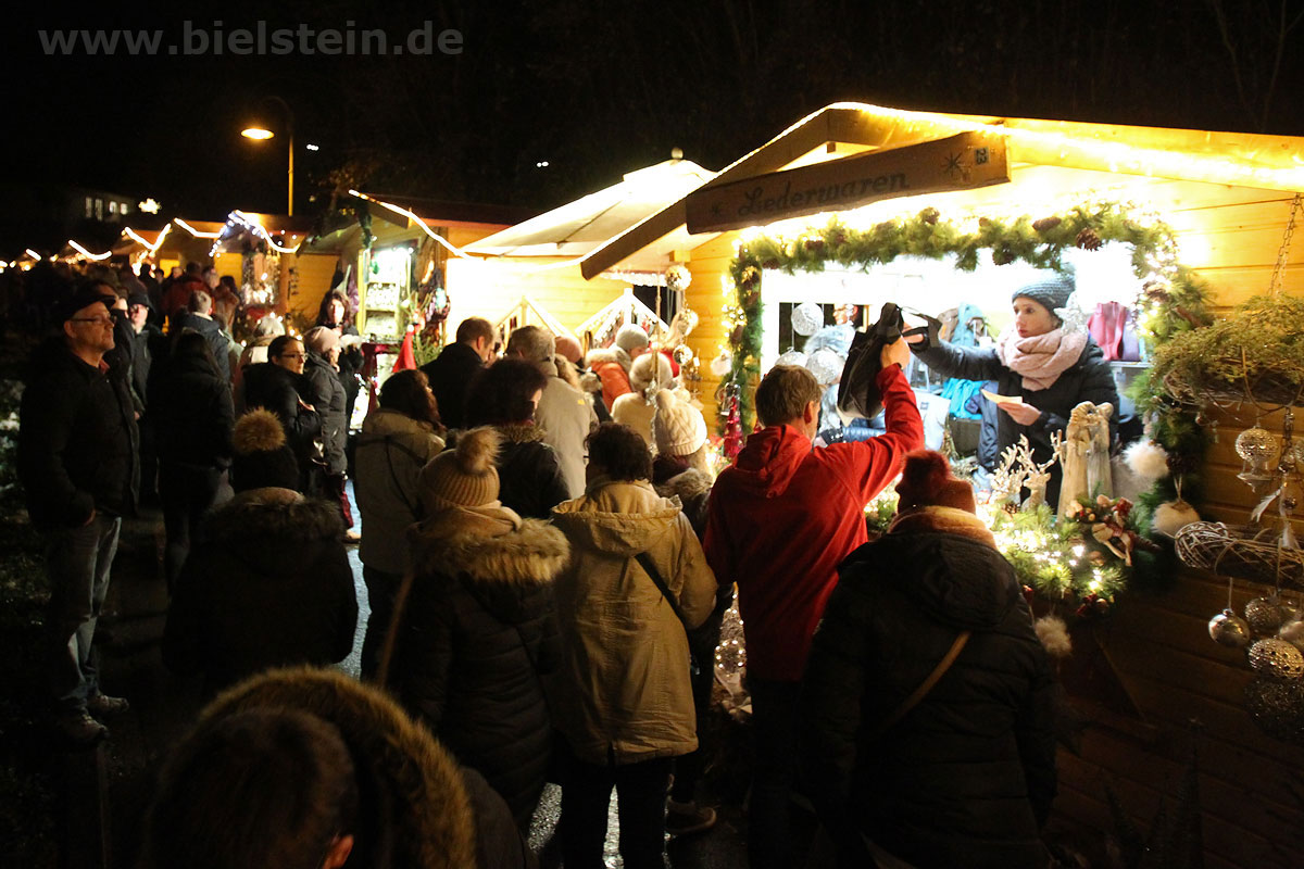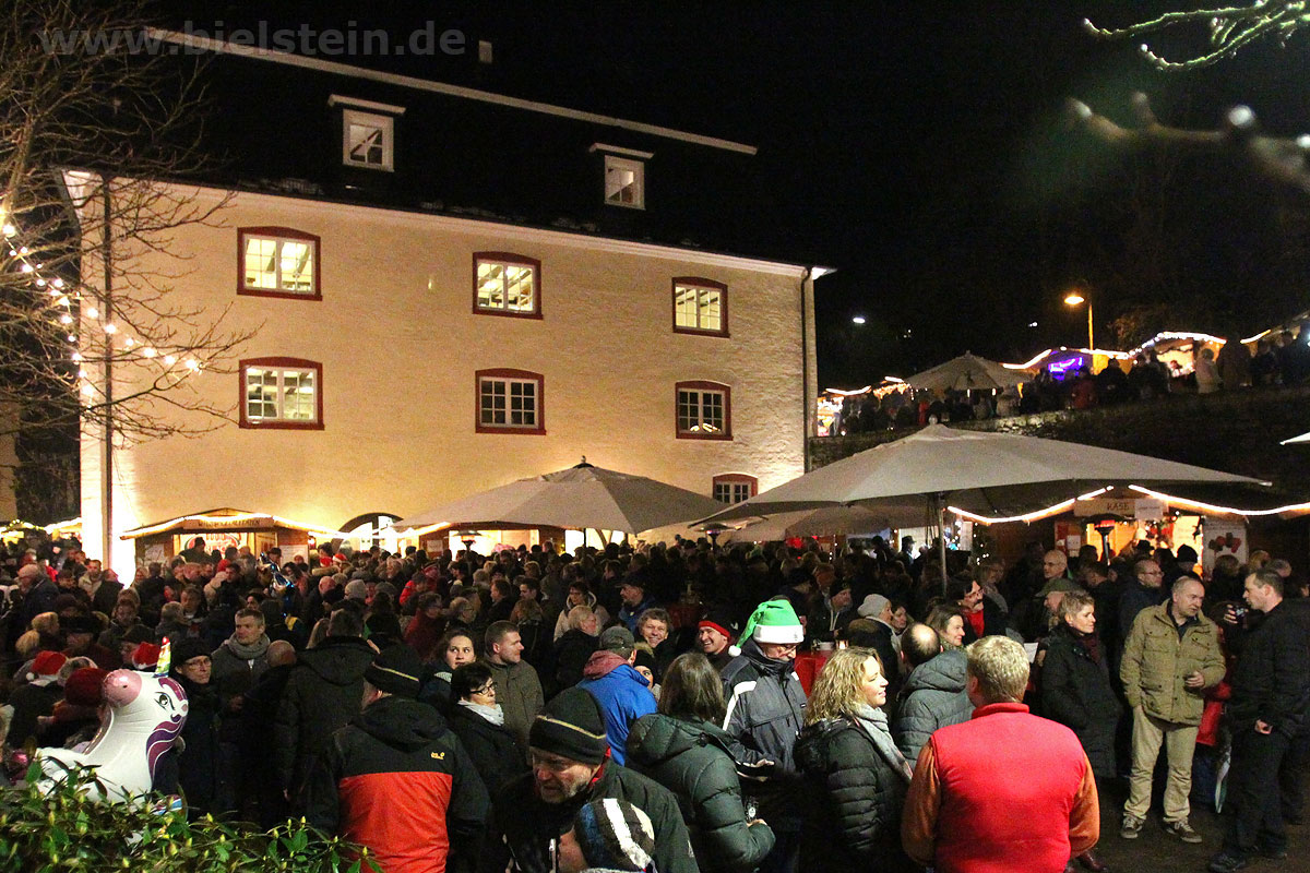 Auch beim zehnten Weihnachtsmarkt rund um das Burghaus in Bielstein kamen – trotz nass-kaltem Wetter – wieder viele Besucher, die den Jubiläums-Weihnachtsmarkt mit viel Atmosphäre genießen wollten. So auch der Landrat des Oberbergischen Kreises, Jochen Hagt, der sich von der vorweihnachtlichen Stimmung am dritten Adventswochenende selbst überzeugte. Wie immer bot Bielstein ausgewählte und abwechslungsreiche Musik im Burghof, eine riesige Auswahl an Kulinarischem und Getränken und auch für den Gabentisch noch ein ausreichendes Angebot in den vielen kleinen Holzhütten rund um das Burghaus.