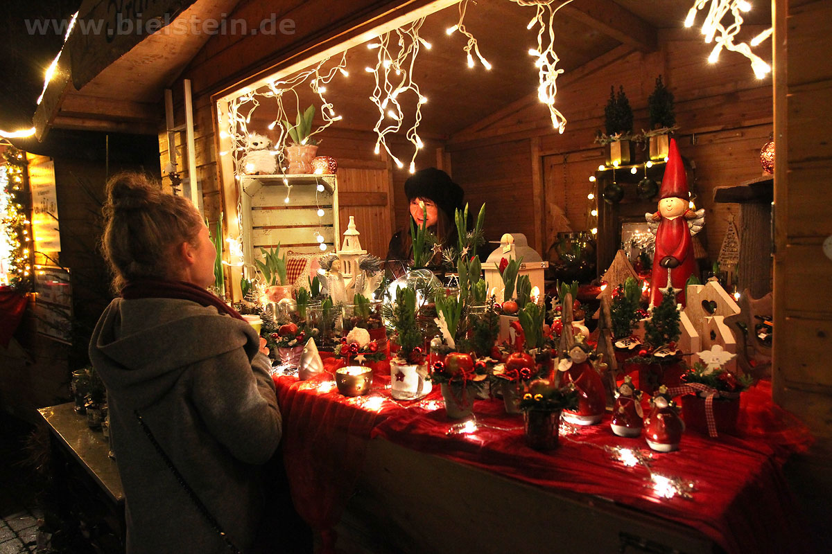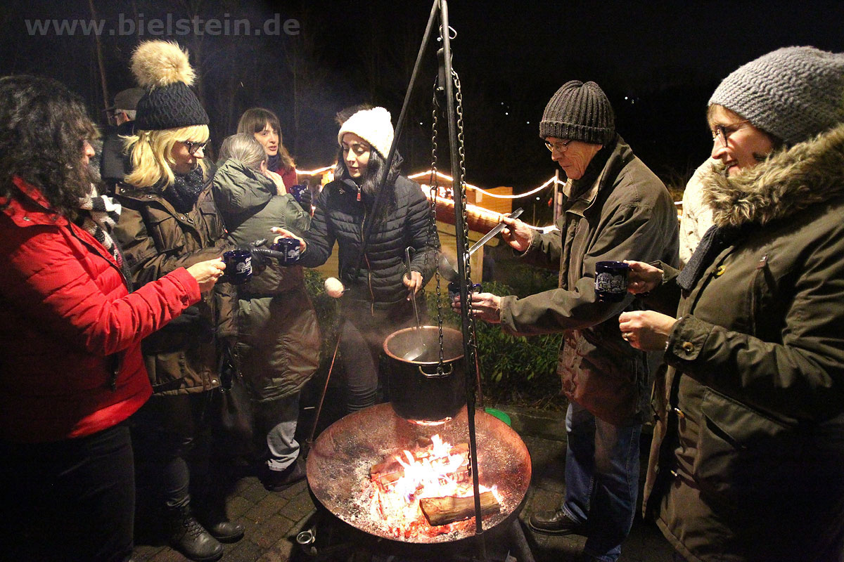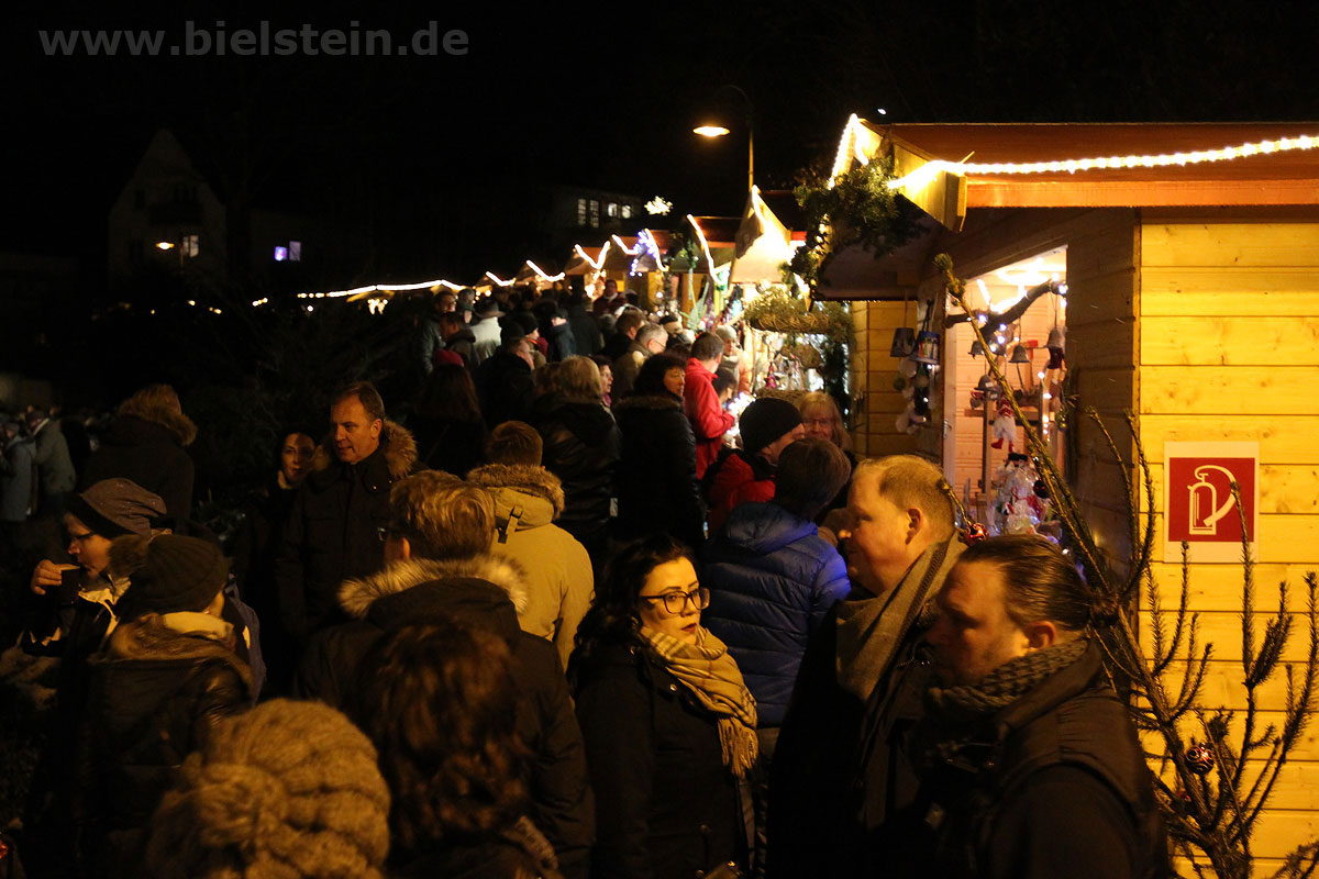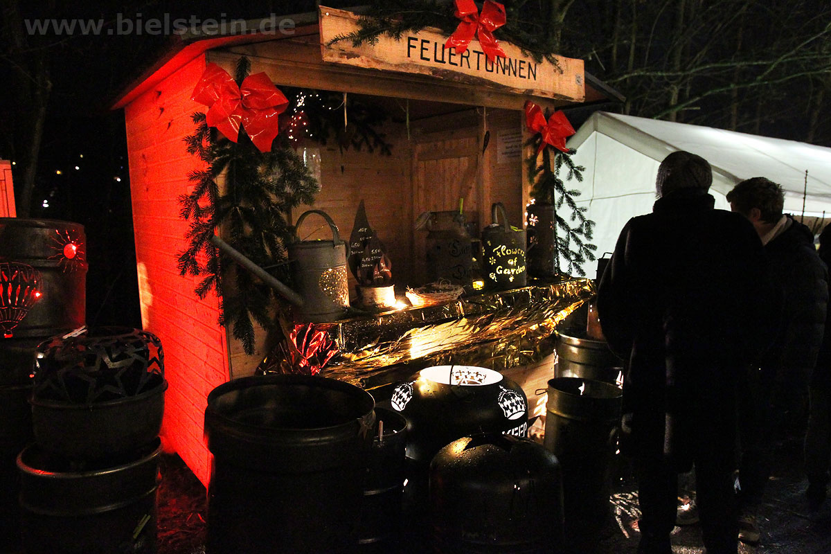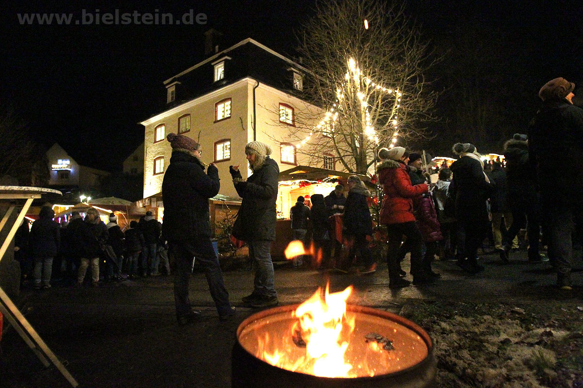Letzte Geschenke am dritten Advent an diversen Ständen finden – kein Problem in Bielstein. Ob selbstgemachte Teddybären, ein Ingwer-Zimt-Rosmarin-Salzfußbad für kalte Füße, Schmuck, Seife oder auch eine Feuertonne. Die fertigen Daniel Groß, Sylvia Dick und Björn Stöcker in Handarbeit für jeden Anlass an. Ob für einen Motorradfan oder mit weihnachtlichem Motiv – ob in einer alten Milchkanne, Gießkanne oder großen Feuertonne, fast alles ist möglich. Und in Bielstein wärmte sich so mancher an der „Christmas“-Feuertonne ein wenig auf. Bürgermeister Ulrich Stücker begrüßte die Besucher des traditionellen Marktes am Samstagnachmittag und würdigte in seiner Ansprache den Beitrag, den die Organisatoren hier leisten. So ein Weihnachtsmarkt wie in Bielstein lade gerade in dieser schnelllebigen Zeit zum Verweilen ein. Und das nahmen auch viele Besucher aus der nahen und ferneren Umgebung gerne wieder war. Am Samstagabend war es kuschelig eng auf dem Hof vorm Burghaus. Wer da noch schnell seine Weihnachtspost abgeben wollte, die hier mit einem Sonderstempel – einem Dürer-Engel – versehen wurde, musste sich durch die Menge schieben. Neben der „Poststelle“ im Foyer hatte Friedhelm Rauch Daub-Touris – wunderbar bunt-schillernde Bilder teilweise in Postkartengröße des Malers Eugen Daub – dabei und am Stand der Diakonie konnten die Besucher Selbstgebasteltes und blau-weiße Diakonie-Muffins erwerben und sich über die Diakonie informieren. Auch der Städtepartnerschaftsverein Wiehl-Hem war wieder dabei und hatte seinen traditionellen Stand kurz vor dem Eingang zum Burghaus-Hof, wo natürlich selbstgemachte Crêpes hergestellt wurden. Nächstes Jahr wird der Markt wieder am dritten Advent-Wochenende stattfinden und das heißt es zum elften Mal: Willkommen auf dem traditionellen Bielsteiner Weihnachtsmarkt!