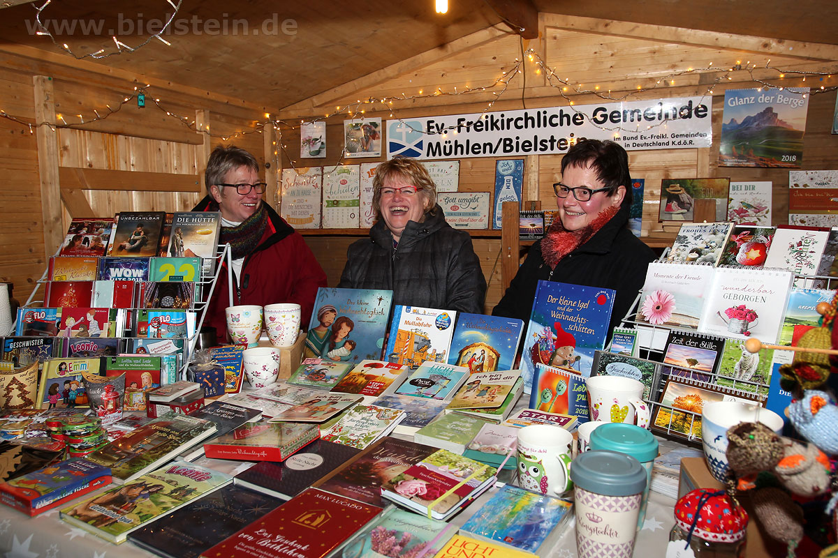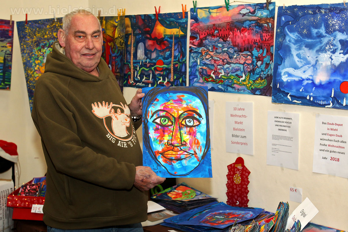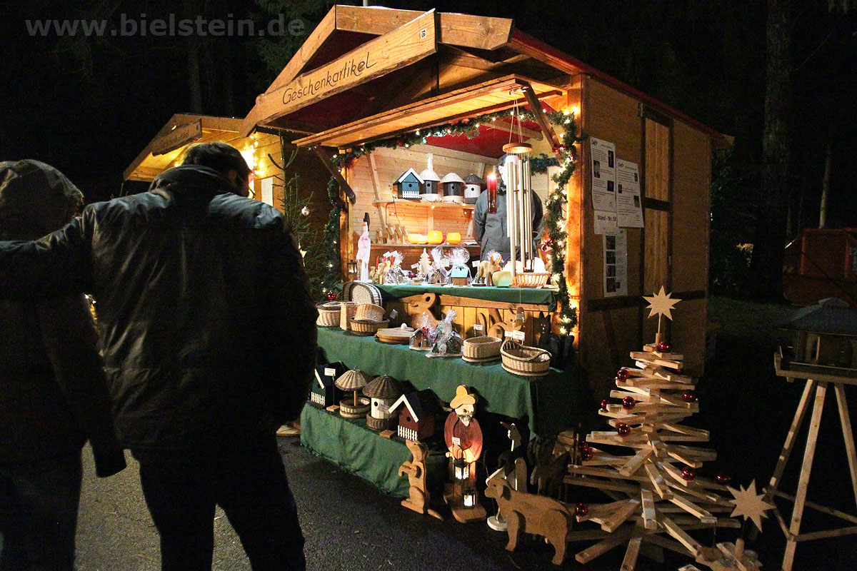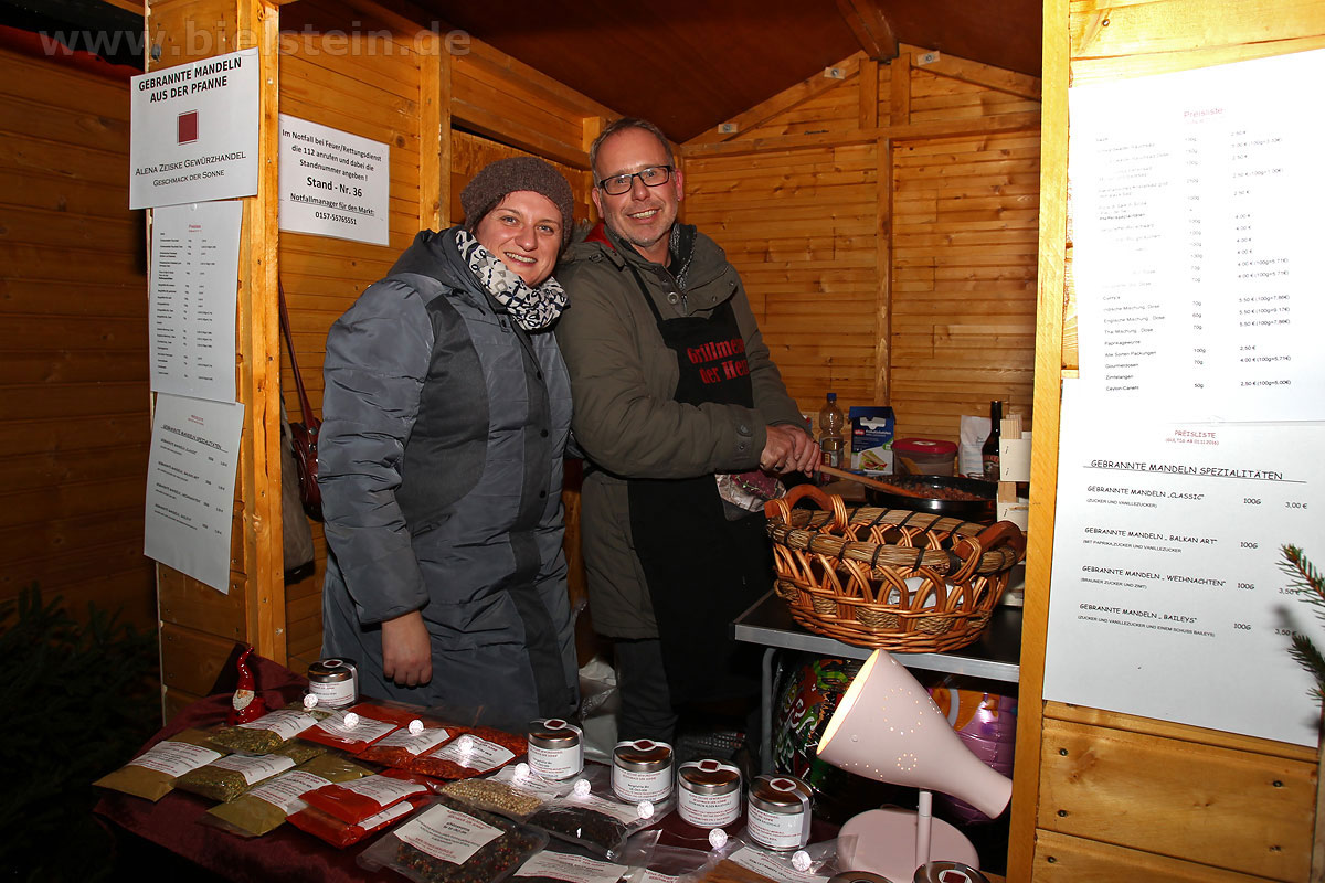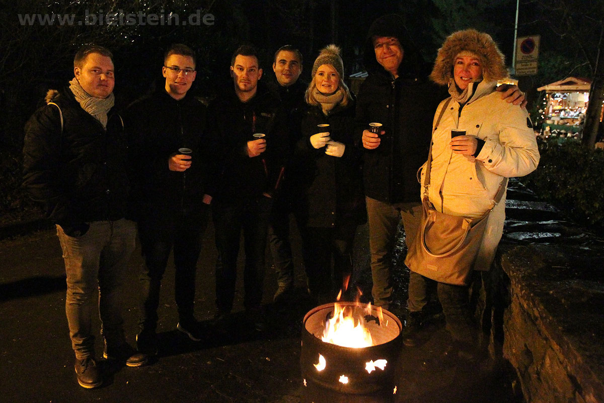 Letzte Geschenke am dritten Advent an diversen Ständen finden – kein Problem in Bielstein. Ob selbstgemachte Teddybären, ein Ingwer-Zimt-Rosmarin-Salzfußbad für kalte Füße, Schmuck, Seife oder auch eine Feuertonne. Die fertigen Daniel Groß, Sylvia Dick und Björn Stöcker in Handarbeit für jeden Anlass an. Ob für einen Motorradfan oder mit weihnachtlichem Motiv – ob in einer alten Milchkanne, Gießkanne oder großen Feuertonne, fast alles ist möglich. Und in Bielstein wärmte sich so mancher an der „Christmas“-Feuertonne ein wenig auf. Bürgermeister Ulrich Stücker begrüßte die Besucher des traditionellen Marktes am Samstagnachmittag und würdigte in seiner Ansprache den Beitrag, den die Organisatoren hier leisten. So ein Weihnachtsmarkt wie in Bielstein lade gerade in dieser schnelllebigen Zeit zum Verweilen ein. Und das nahmen auch viele Besucher aus der nahen und ferneren Umgebung gerne wieder war. Am Samstagabend war es kuschelig eng auf dem Hof vorm Burghaus. Wer da noch schnell seine Weihnachtspost abgeben wollte, die hier mit einem Sonderstempel – einem Dürer-Engel – versehen wurde, musste sich durch die Menge schieben. Neben der „Poststelle“ im Foyer hatte Friedhelm Rauch Daub-Touris – wunderbar bunt-schillernde Bilder teilweise in Postkartengröße des Malers Eugen Daub – dabei und am Stand der Diakonie konnten die Besucher Selbstgebasteltes und blau-weiße Diakonie-Muffins erwerben und sich über die Diakonie informieren. Auch der Städtepartnerschaftsverein Wiehl-Hem war wieder dabei und hatte seinen traditionellen Stand kurz vor dem Eingang zum Burghaus-Hof, wo natürlich selbstgemachte Crêpes hergestellt wurden. Nächstes Jahr wird der Markt wieder am dritten Advent-Wochenende stattfinden und das heißt es zum elften Mal: Willkommen auf dem traditionellen Bielsteiner Weihnachtsmarkt!