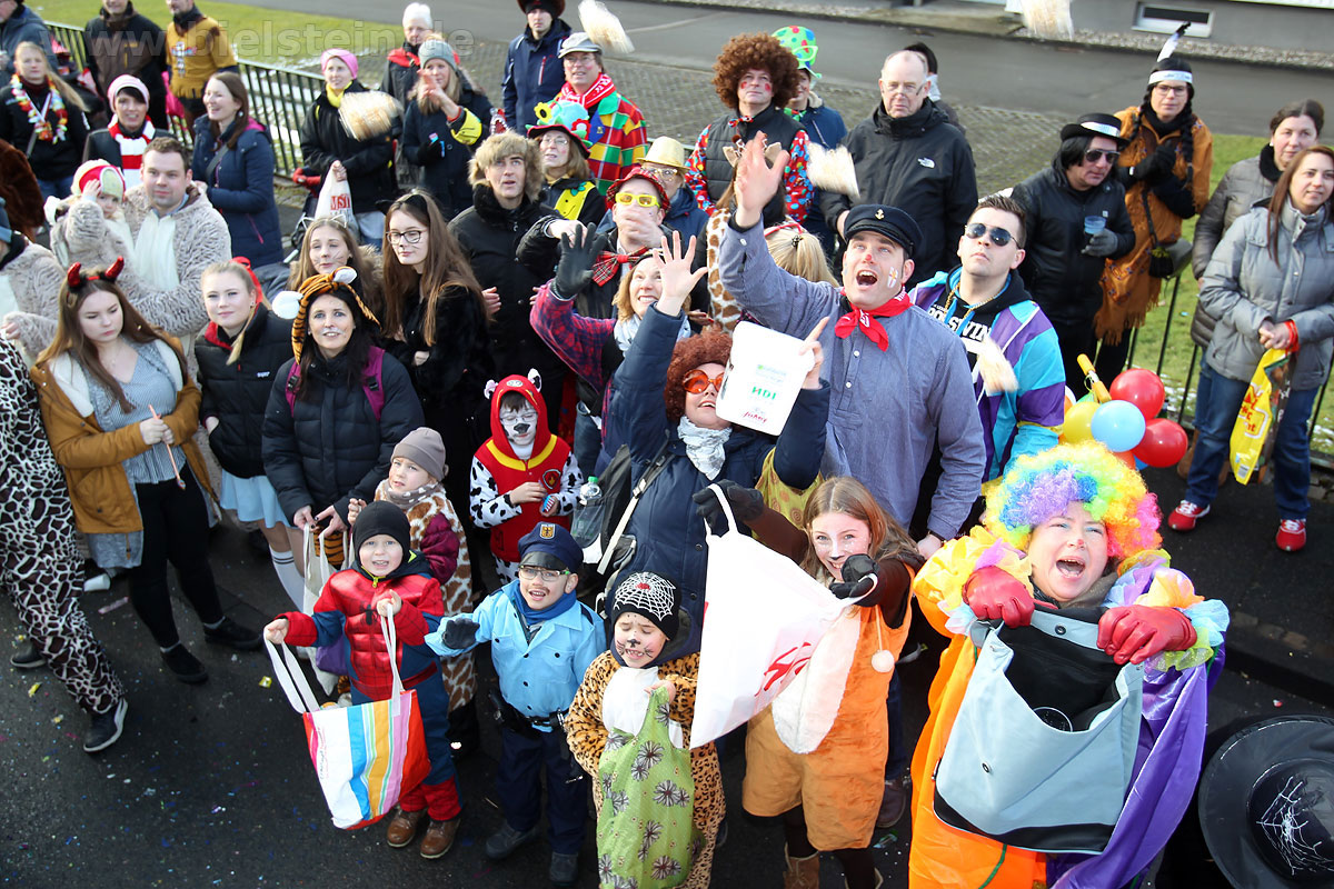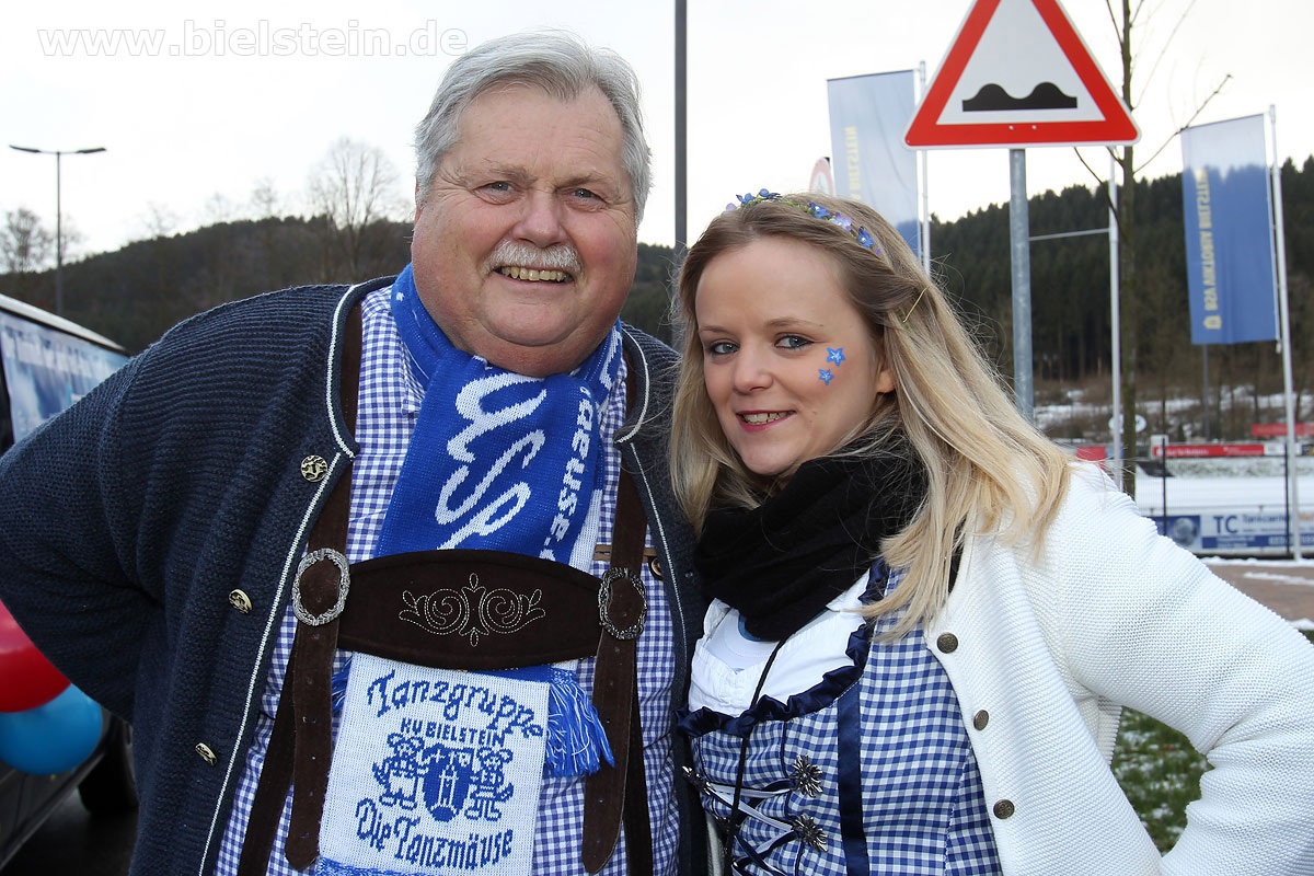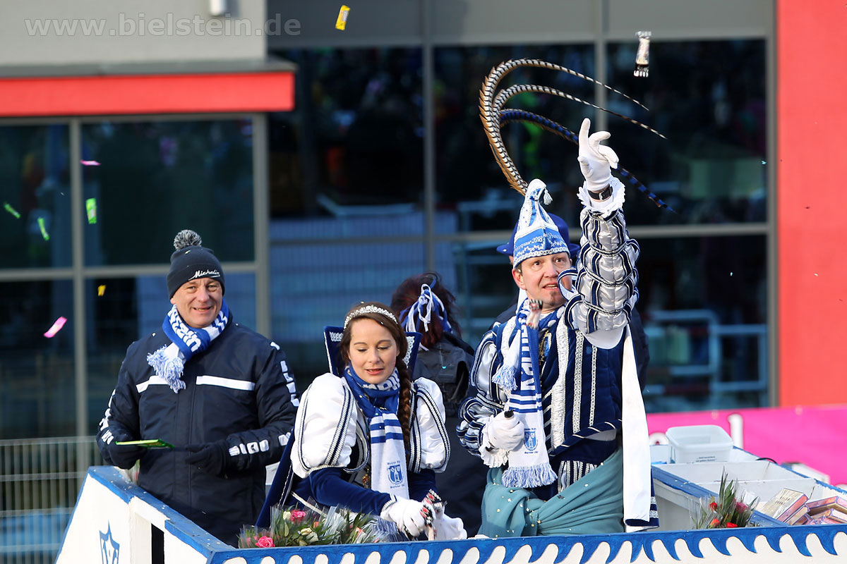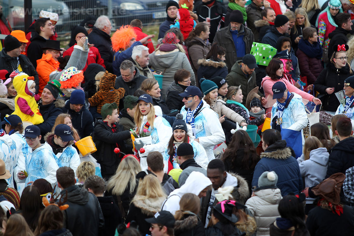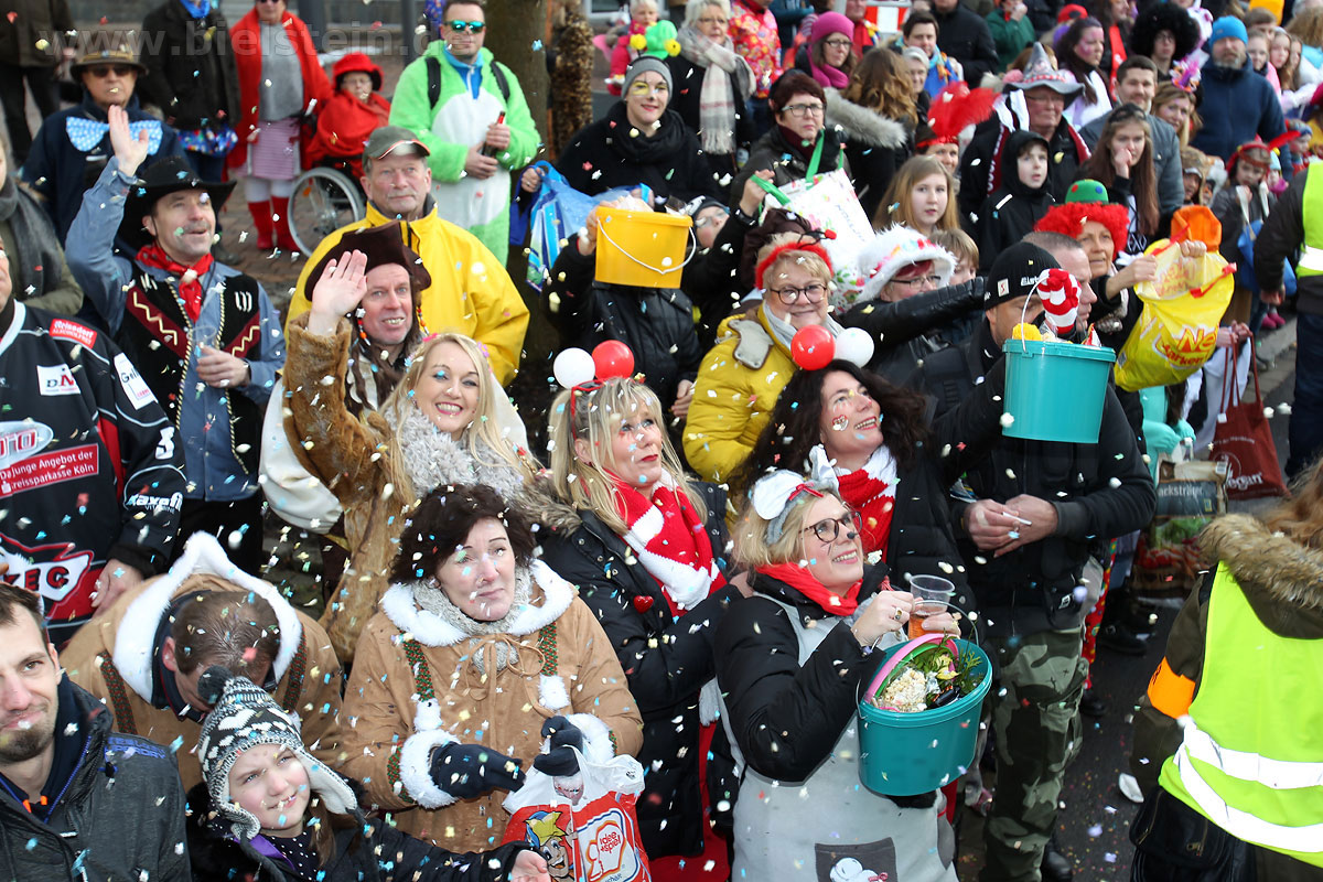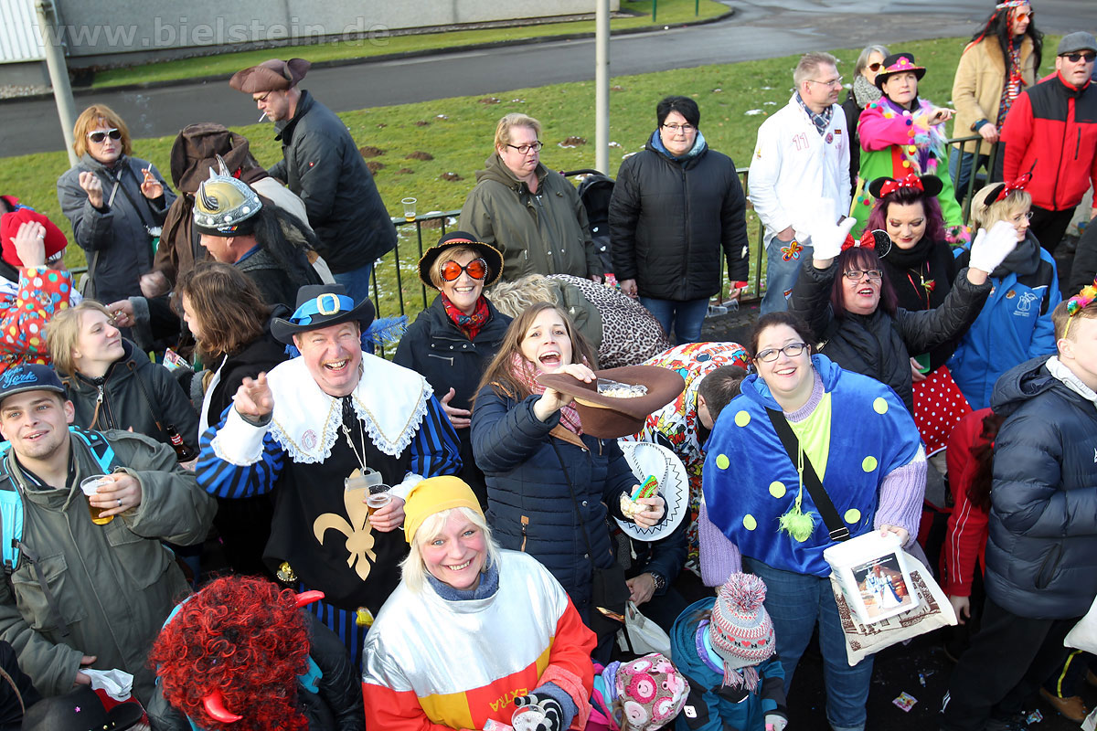 Auch mit dem Wetter hatten die Jecken Glück, denn der Himmel war passend blau-weiß und die Sonne schaute öfter mal zwischen den Wolken hervor und wärmte die auf den Kamelle-Regen wartenden Bielsteiner immer wieder mal auf.