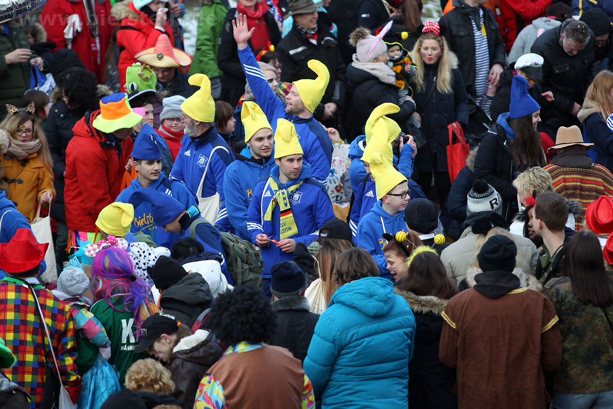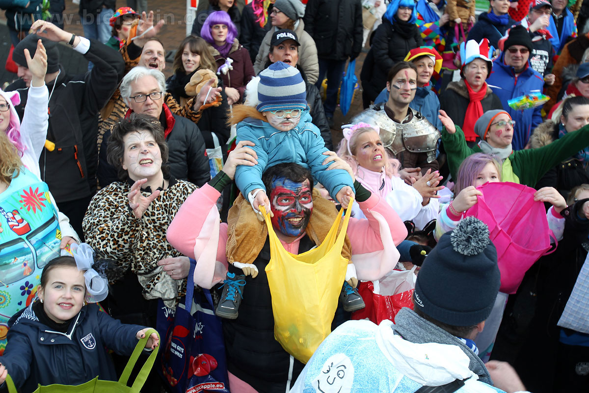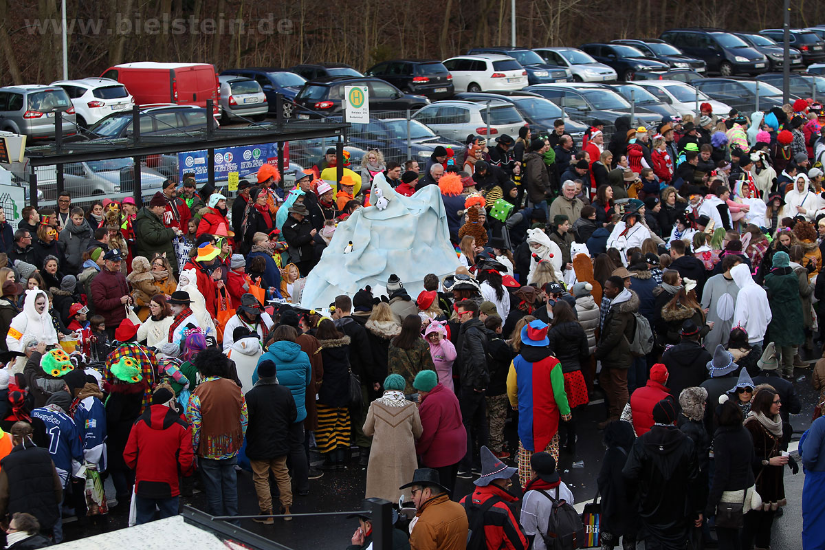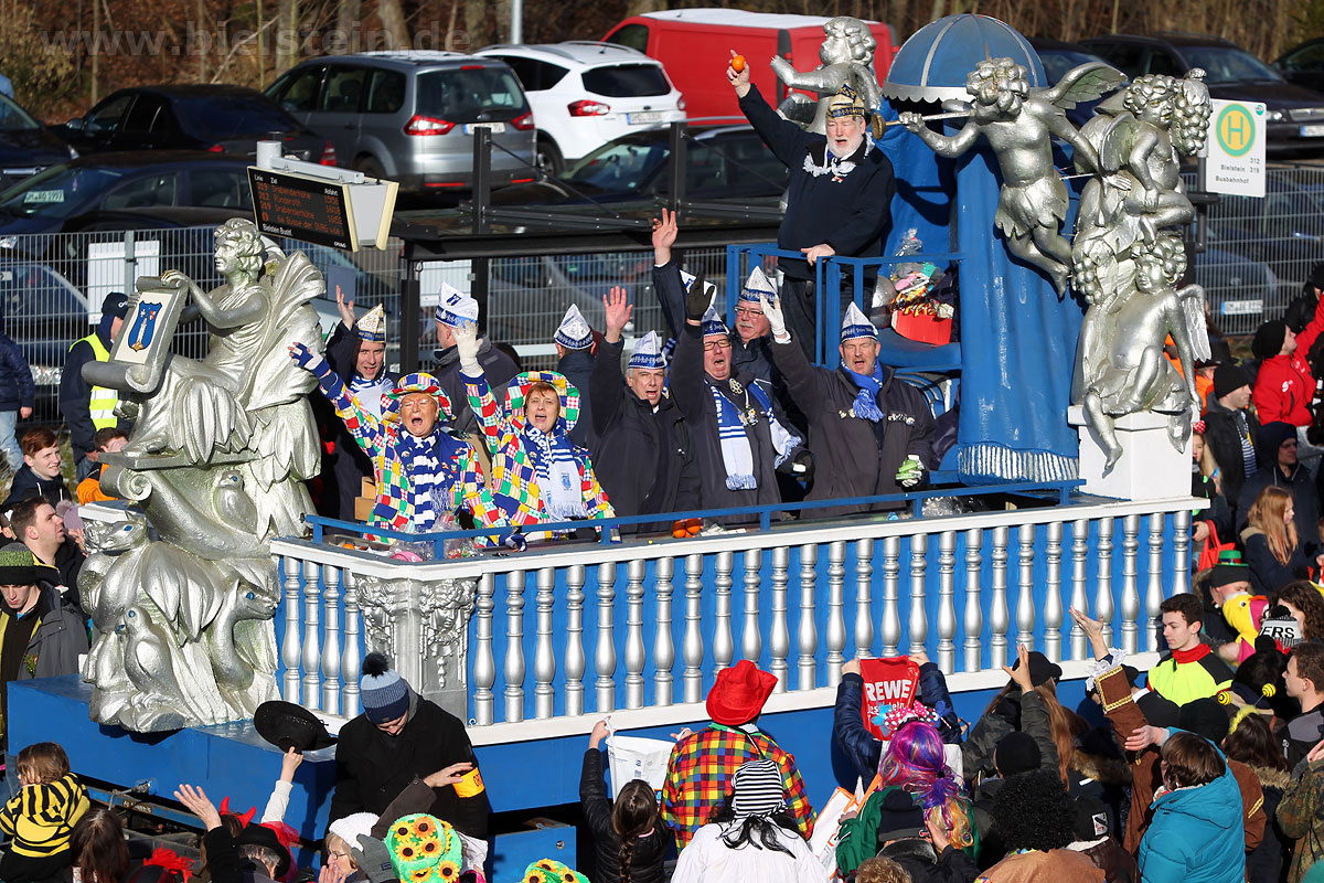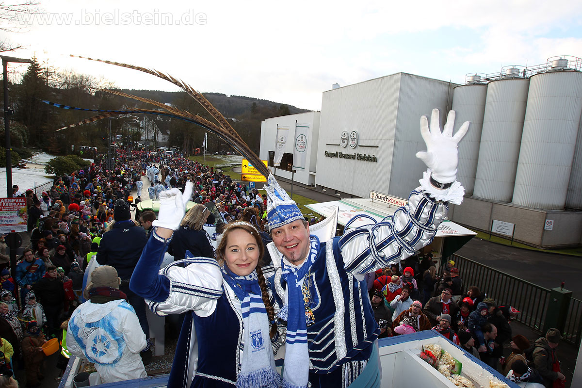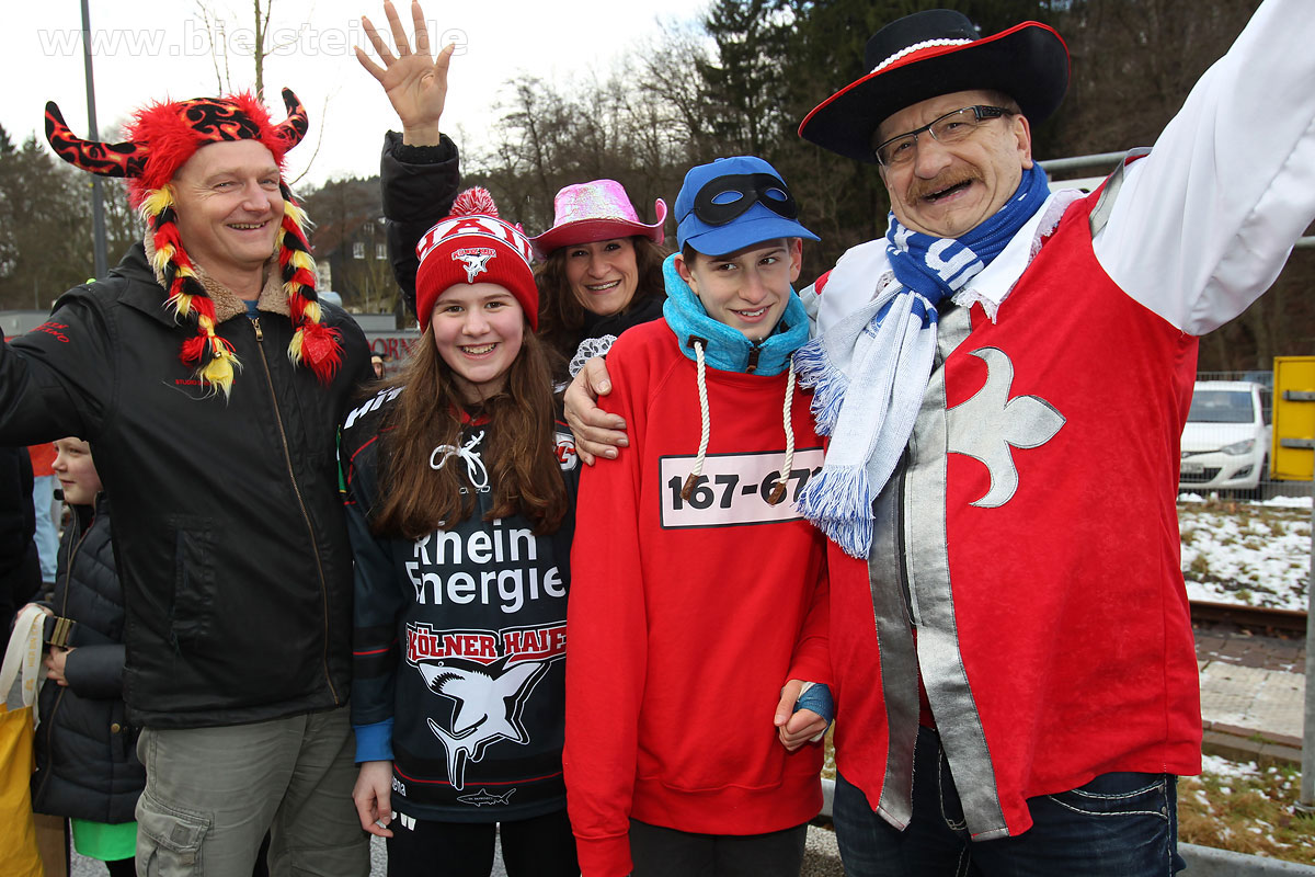 Auch mit dem Wetter hatten die Jecken Glück, denn der Himmel war passend blau-weiß und die Sonne schaute öfter mal zwischen den Wolken hervor und wärmte die auf den Kamelle-Regen wartenden Bielsteiner immer wieder mal auf.