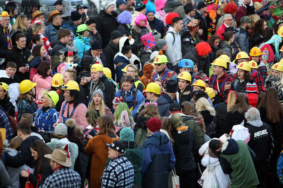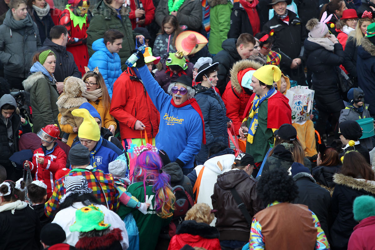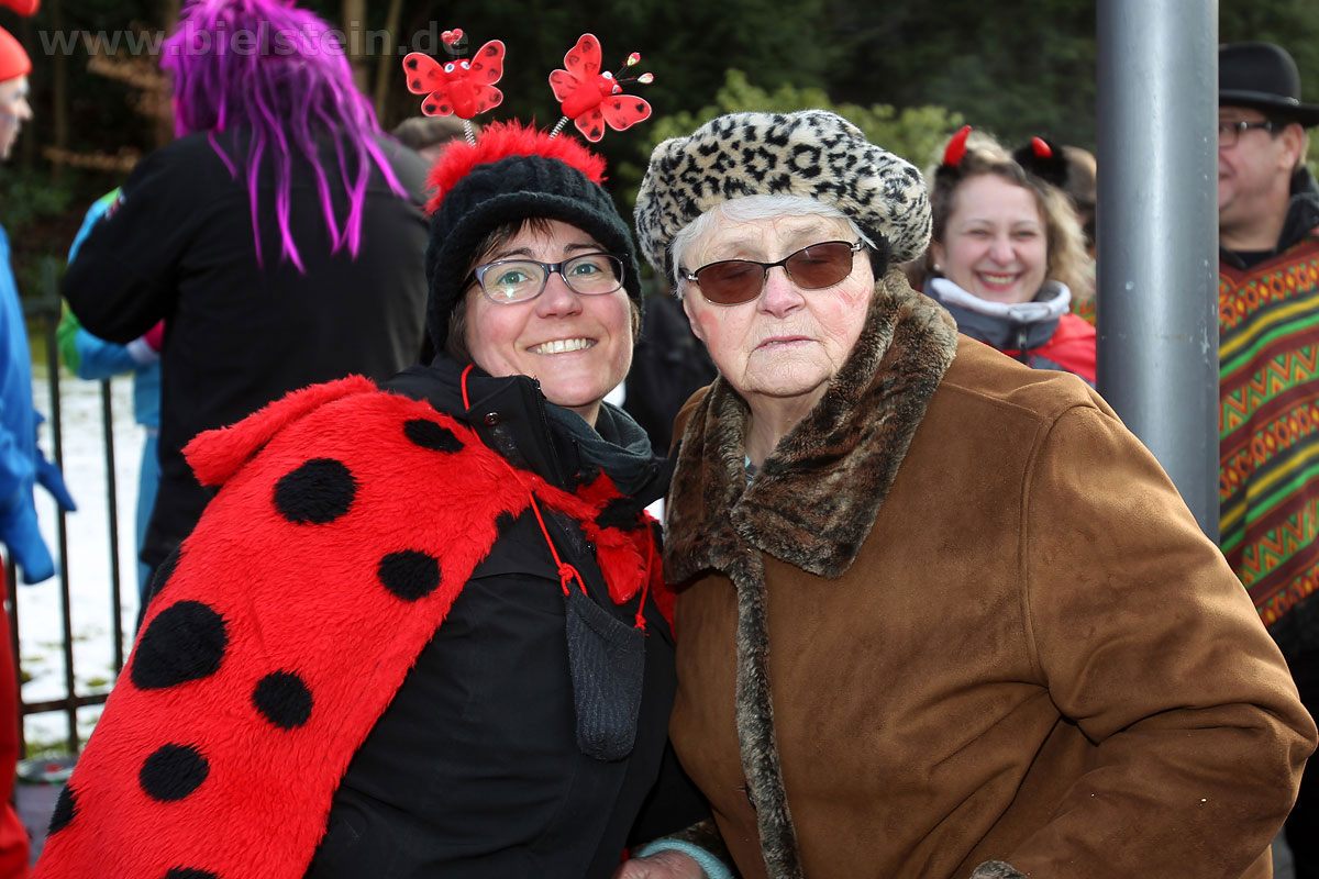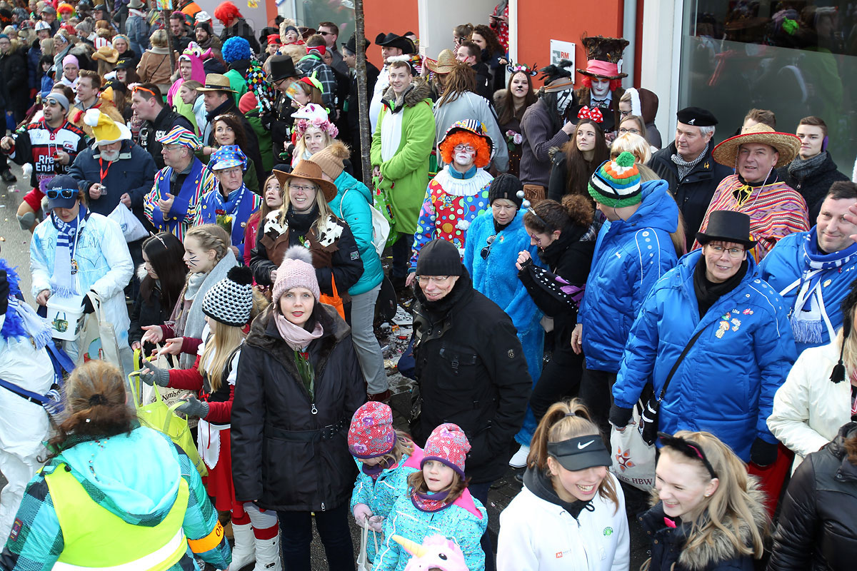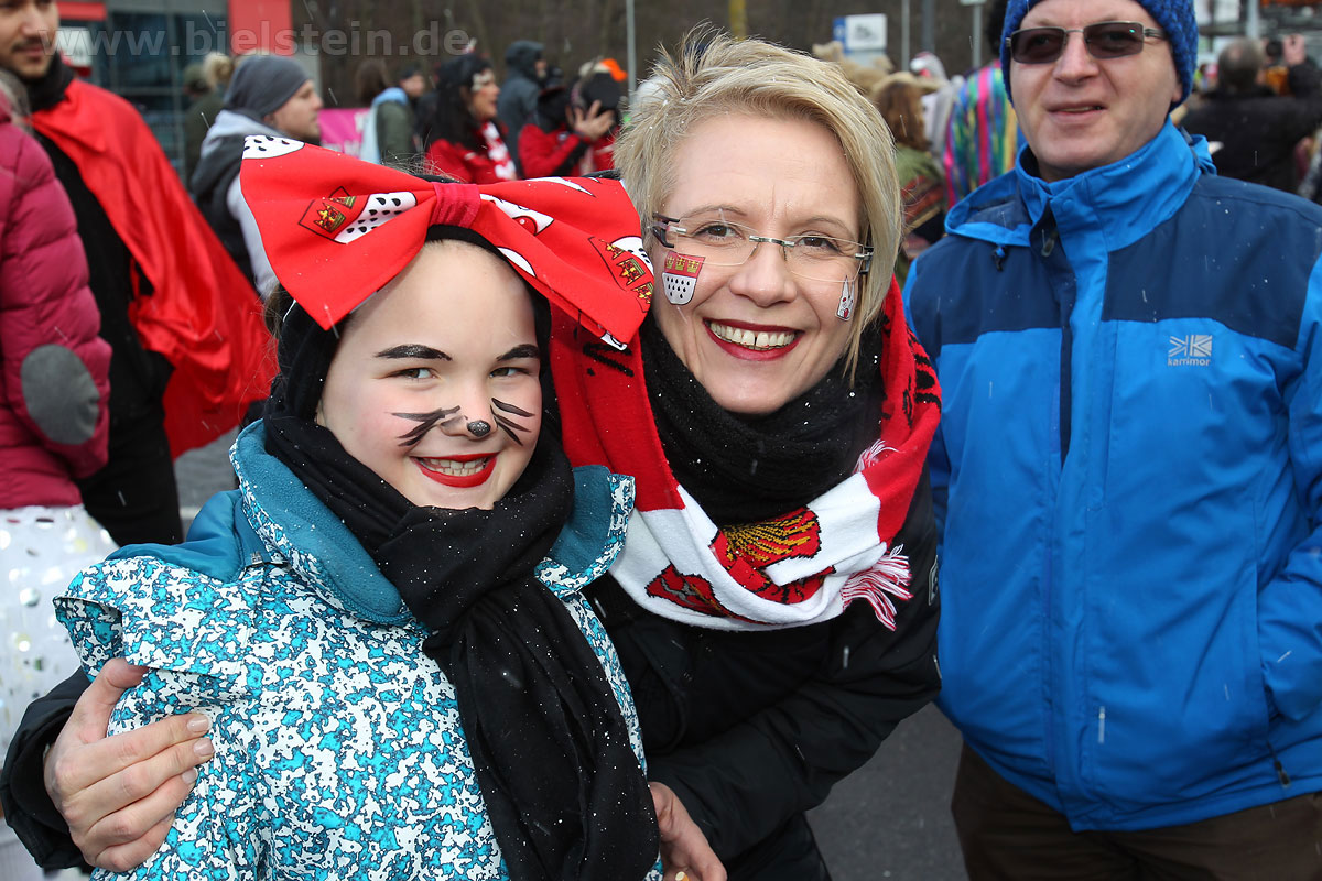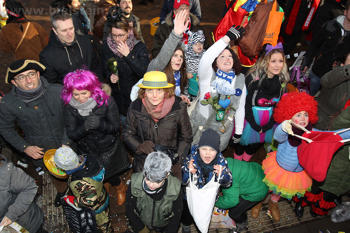 Auch mit dem Wetter hatten die Jecken Glück, denn der Himmel war passend blau-weiß und die Sonne schaute öfter mal zwischen den Wolken hervor und wärmte die auf den Kamelle-Regen wartenden Bielsteiner immer wieder mal auf.