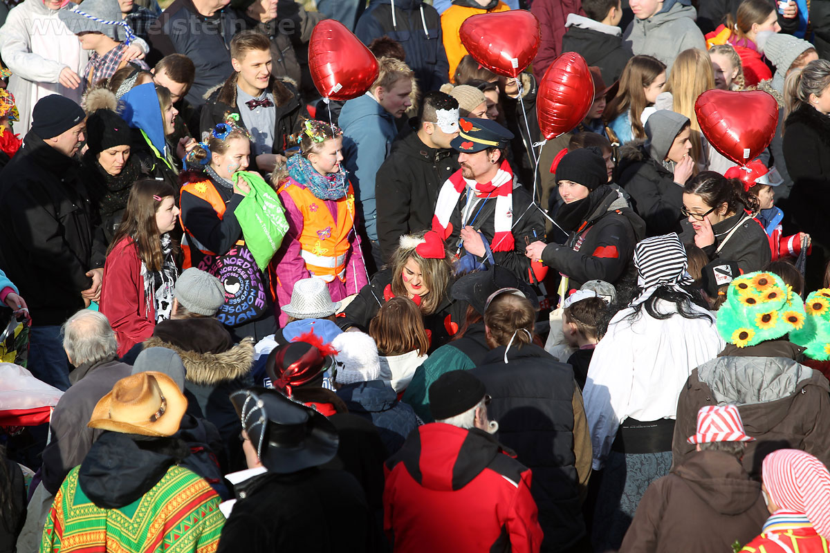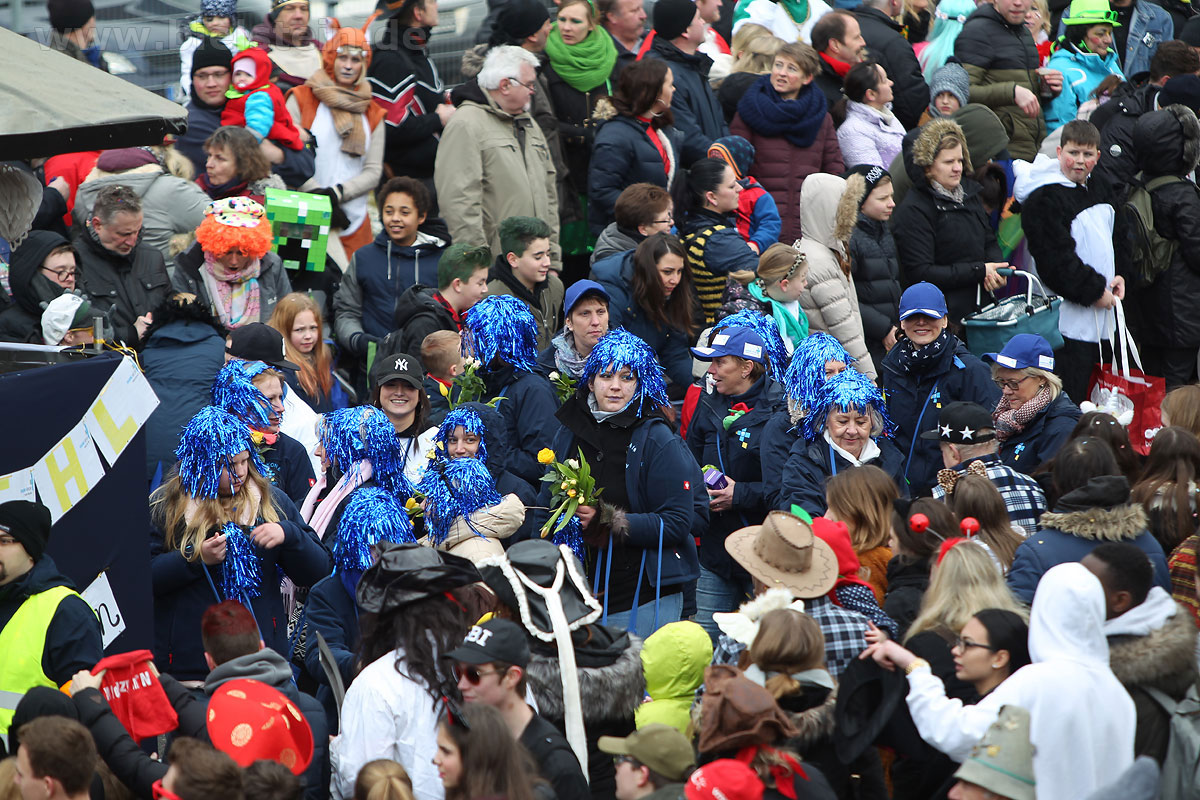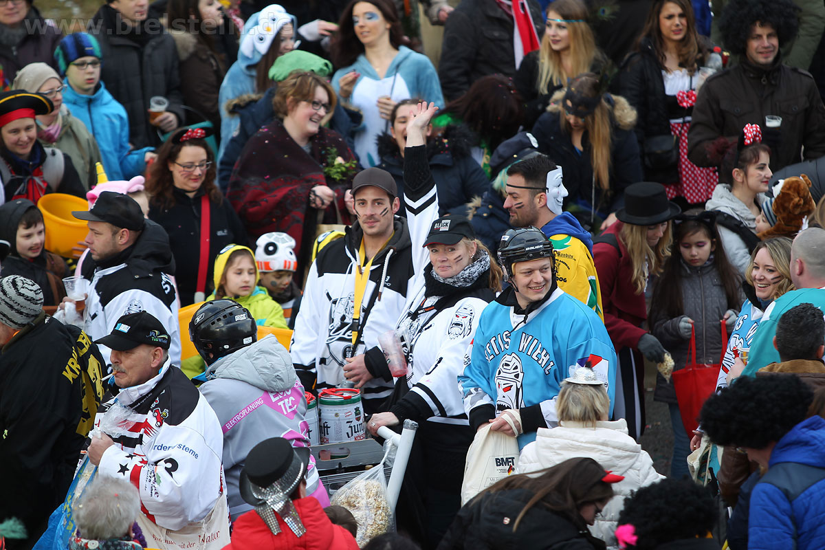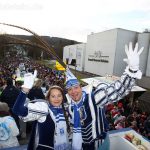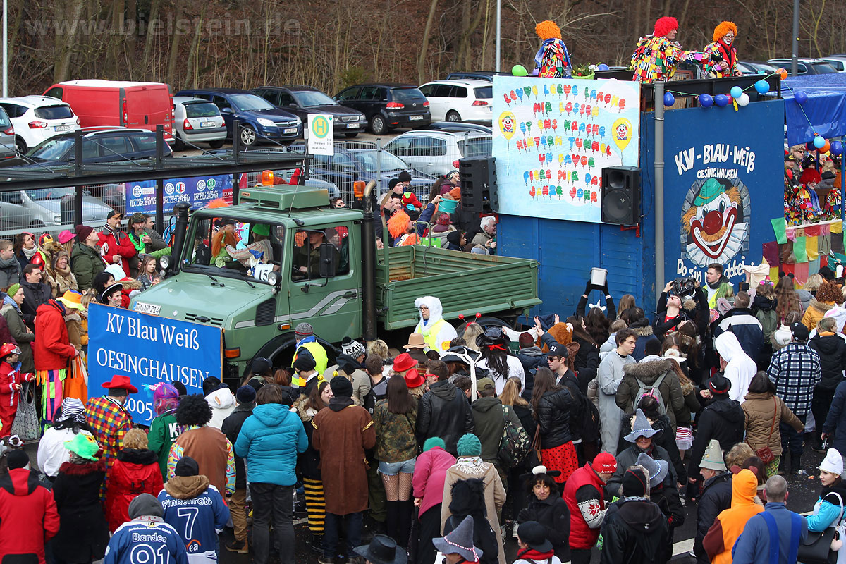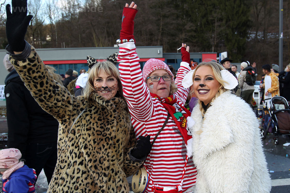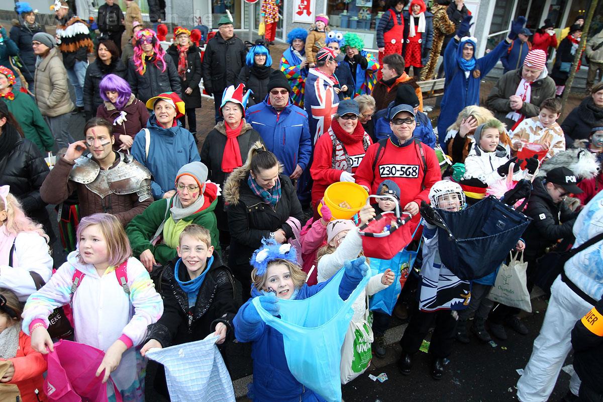Auch mit dem Wetter hatten die Jecken Glück, denn der Himmel war passend blau-weiß und die Sonne schaute öfter mal zwischen den Wolken hervor und wärmte die auf den Kamelle-Regen wartenden Bielsteiner immer wieder mal auf.