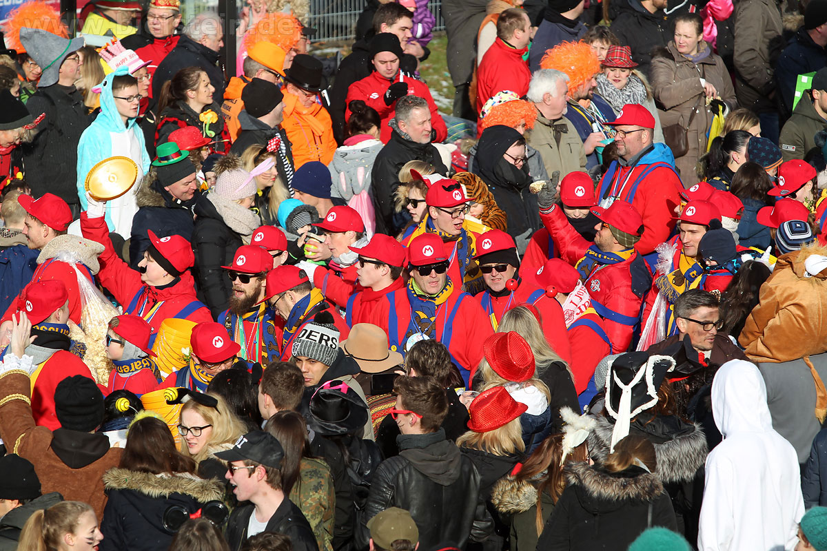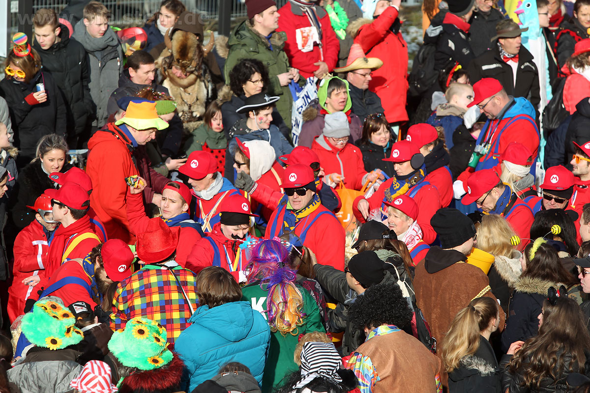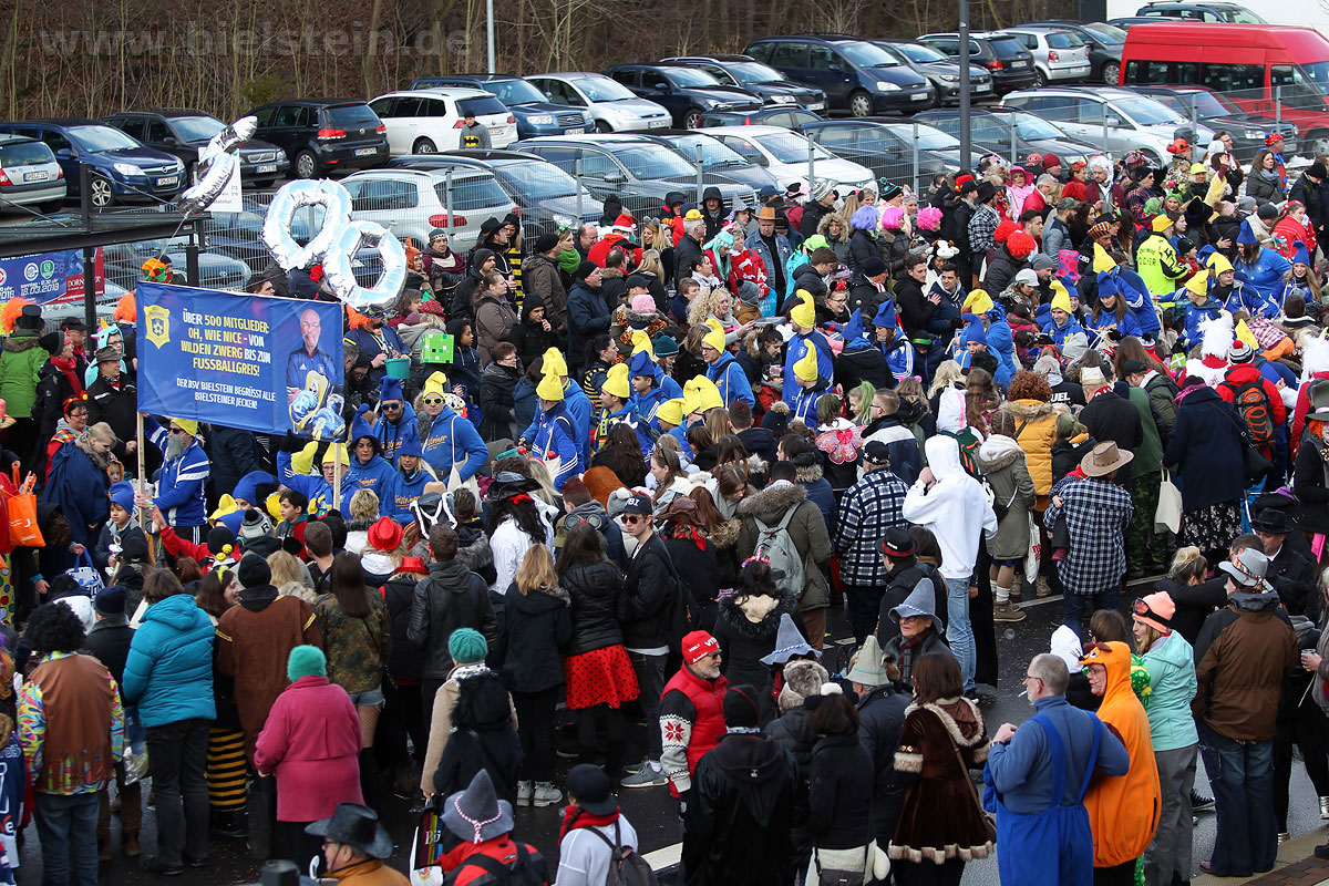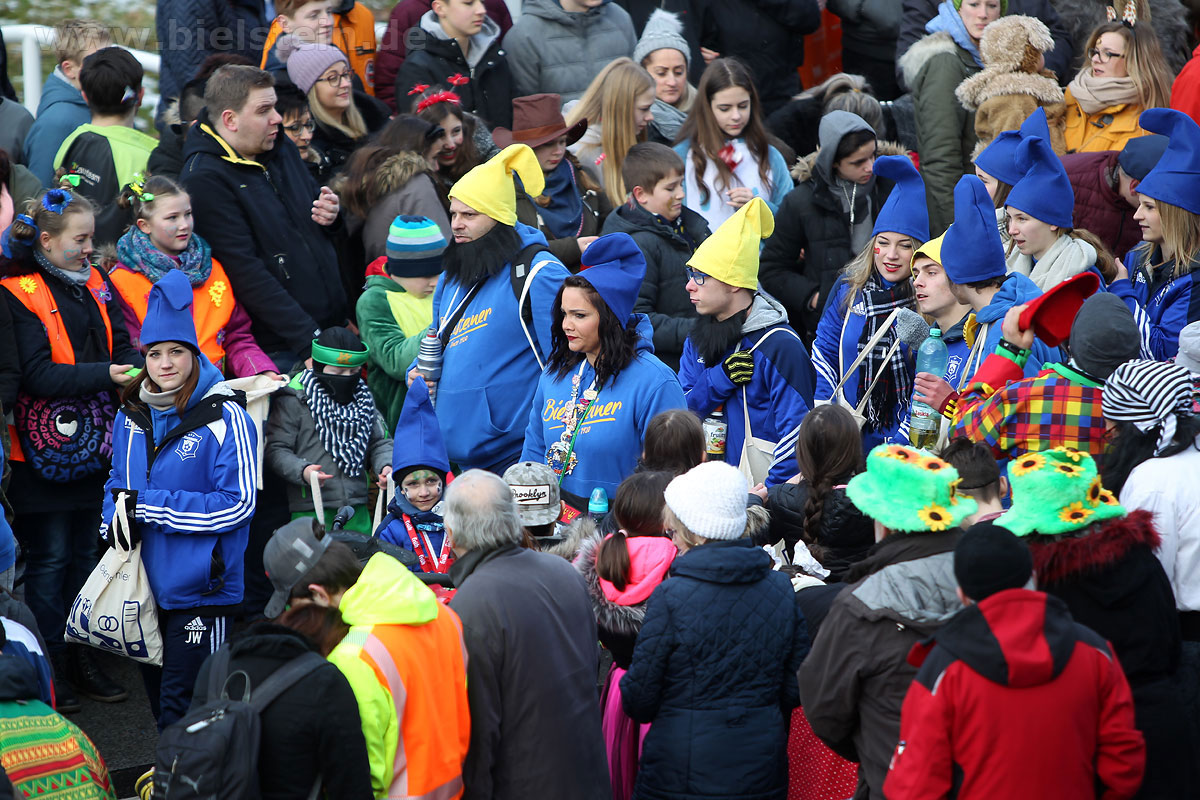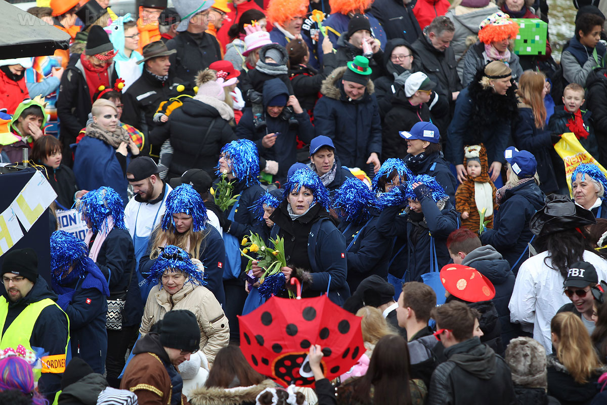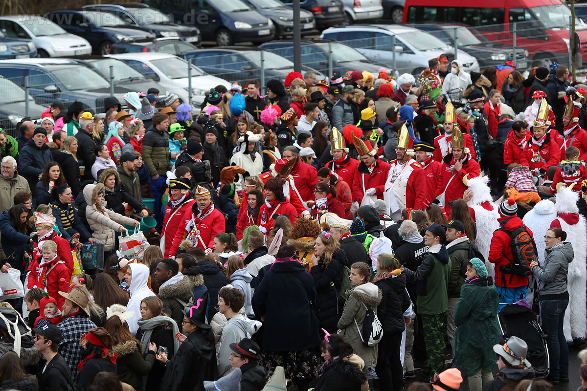 Auch mit dem Wetter hatten die Jecken Glück, denn der Himmel war passend blau-weiß und die Sonne schaute öfter mal zwischen den Wolken hervor und wärmte die auf den Kamelle-Regen wartenden Bielsteiner immer wieder mal auf.