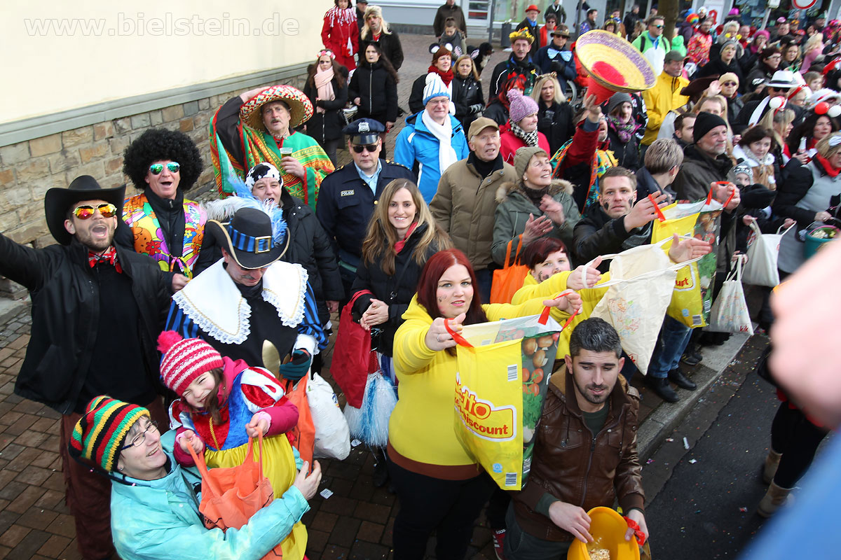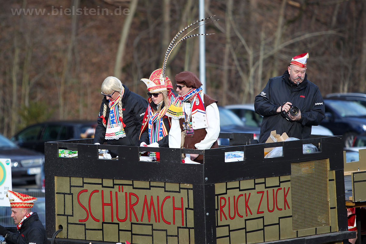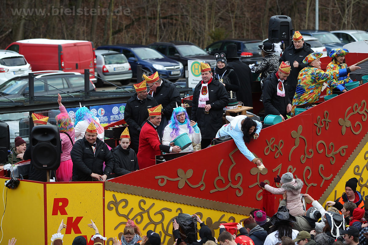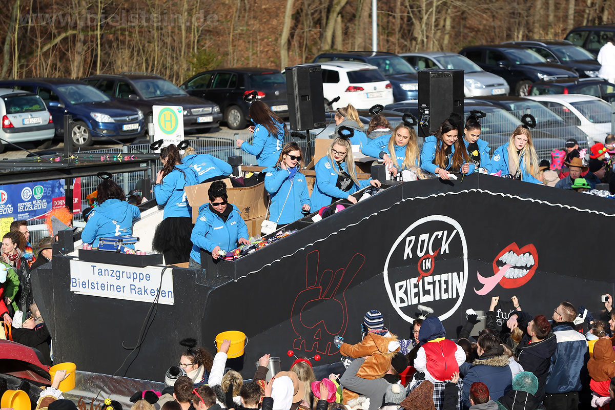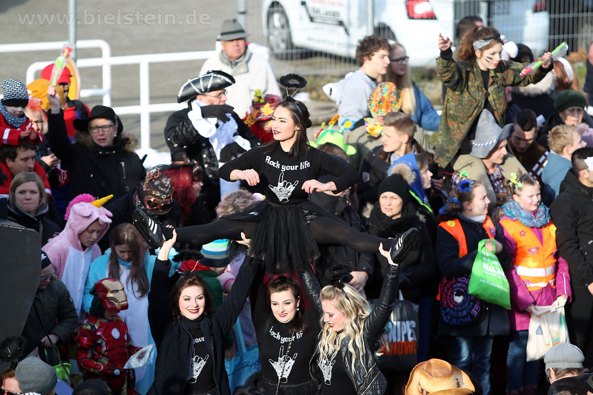 Die Bielsteiner Tanzgruppen waren selbstverständlich auch alle beim Rosenmontagszug mit dabei: Die Lollipops und Crazys, die Raketen und die Tanzmäuse und den Abschluss des Rosenmontagszuges bildeten natürlich Prinz Peter I. und Prinzessin Melanie, die ihr Motto „Seid versichert, wir geben Gummi“ ernst nahmen und beide äußerst spendabel die vielen Leckereien auf das Fußvolk schleuderten.