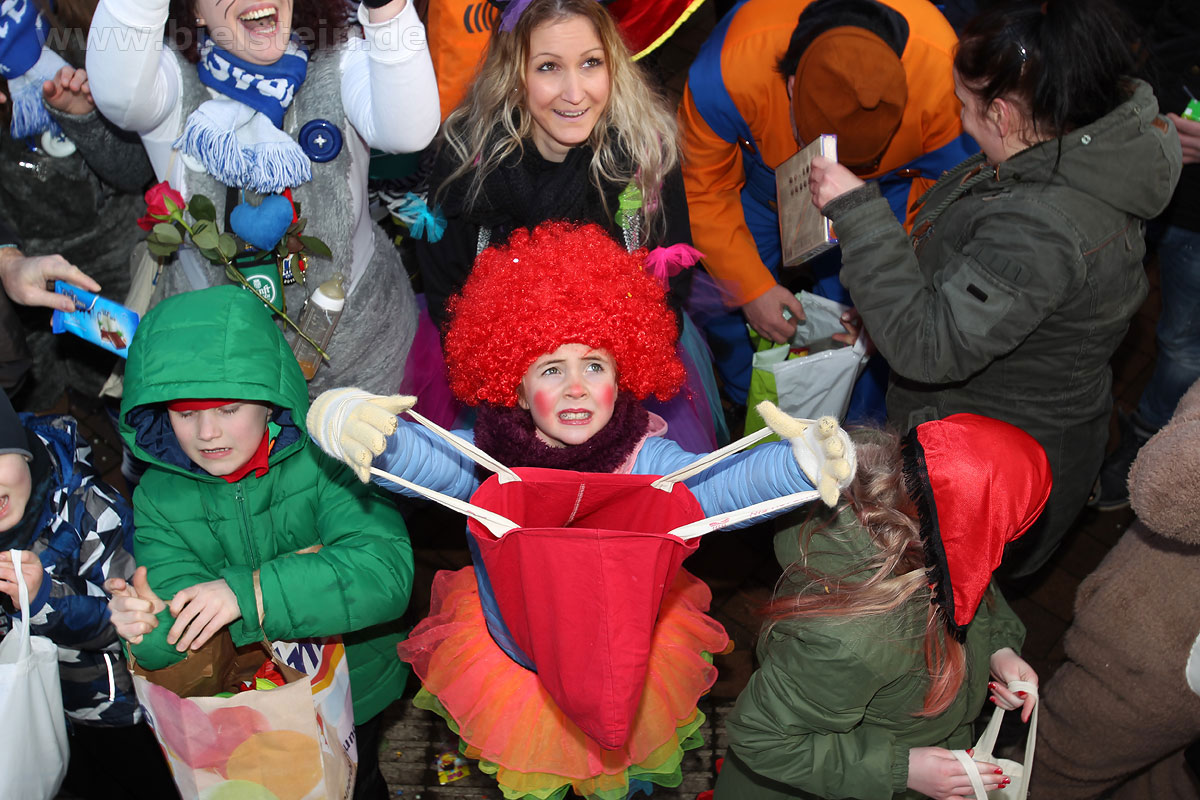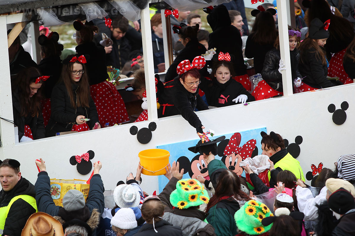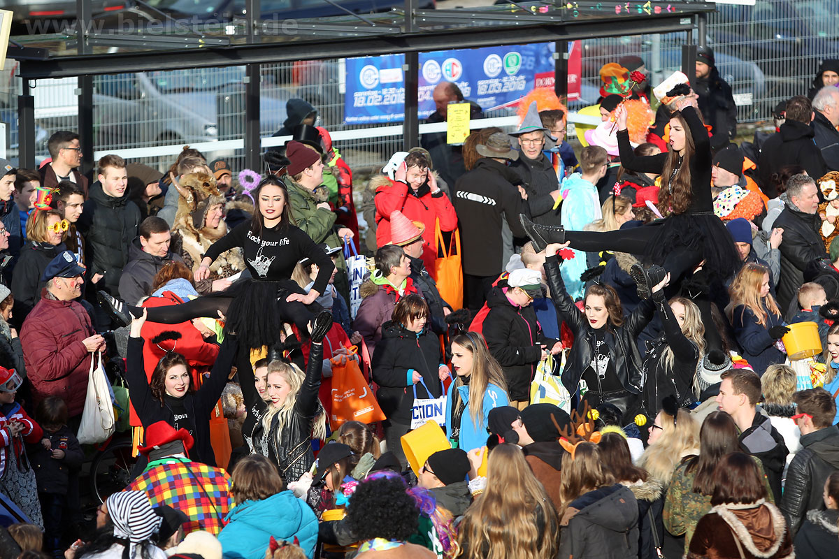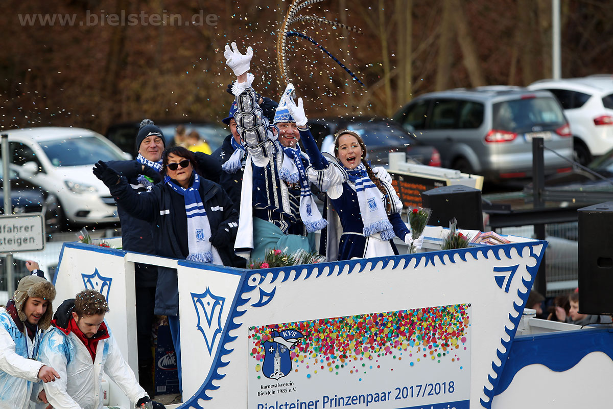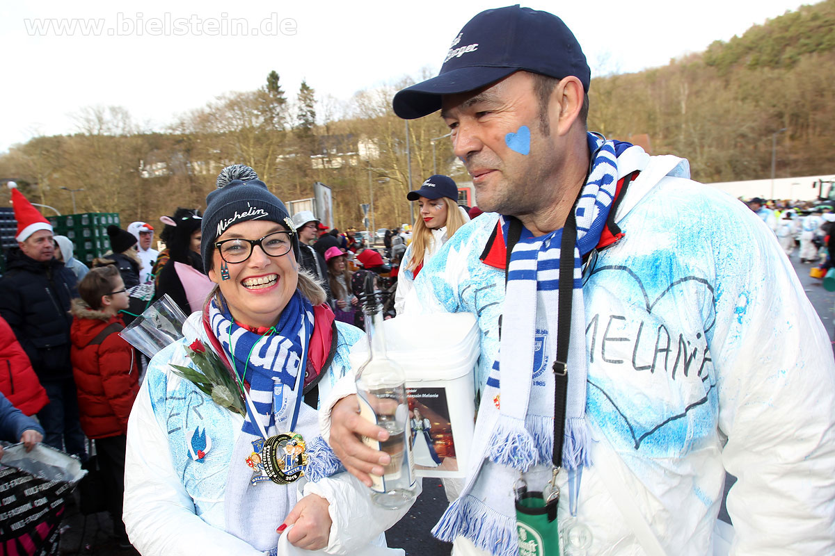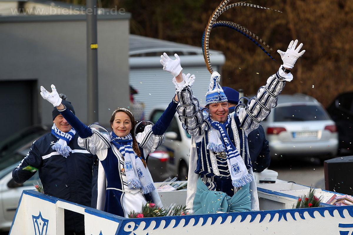 Die Bielsteiner Tanzgruppen waren selbstverständlich auch alle beim Rosenmontagszug mit dabei: Die Lollipops und Crazys, die Raketen und die Tanzmäuse und den Abschluss des Rosenmontagszuges bildeten natürlich Prinz Peter I. und Prinzessin Melanie, die ihr Motto „Seid versichert, wir geben Gummi“ ernst nahmen und beide äußerst spendabel die vielen Leckereien auf das Fußvolk schleuderten.