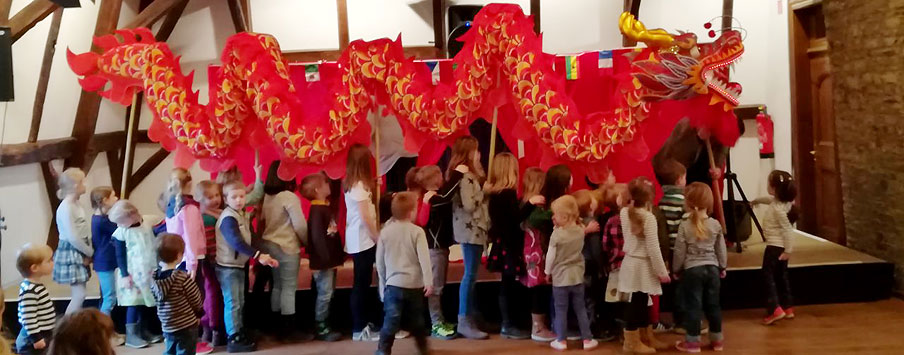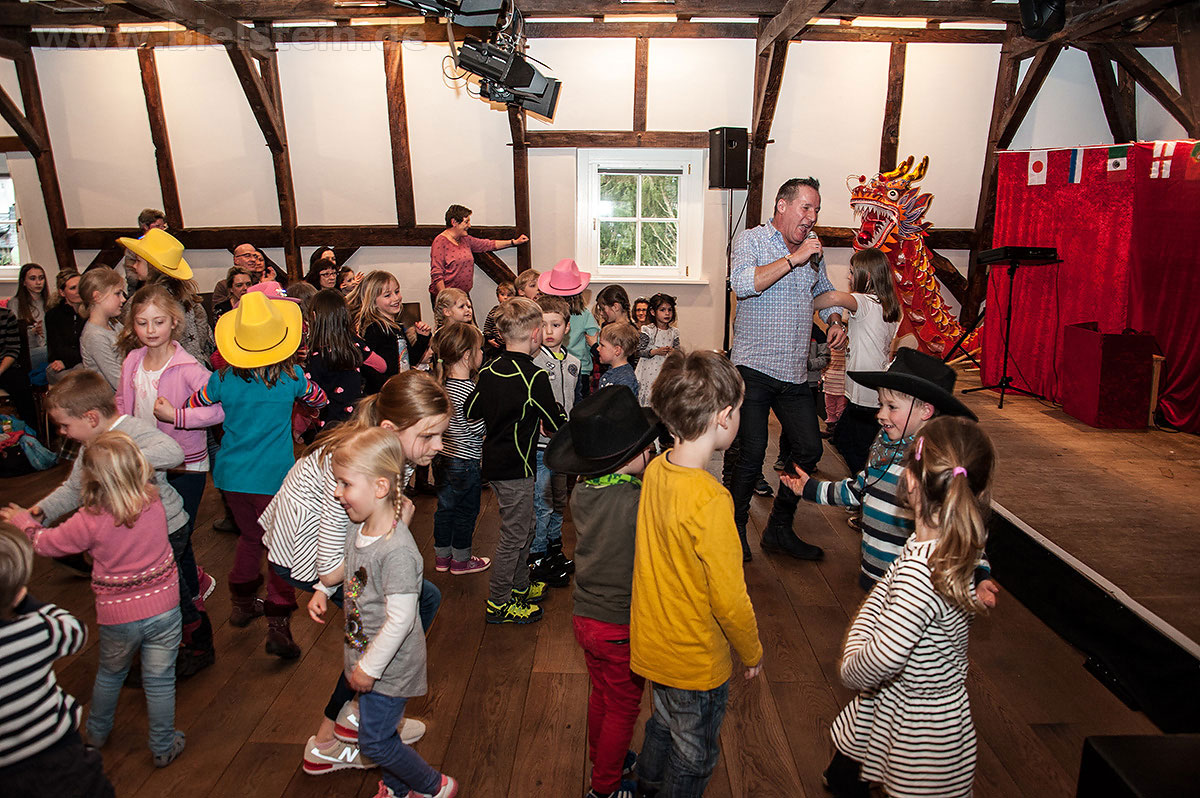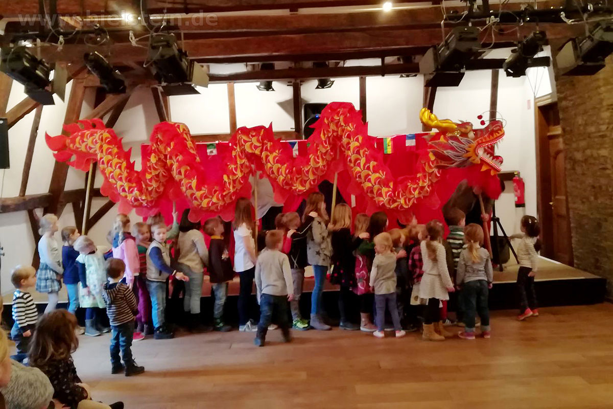 Mitsinge, mitmachen und mitlachen konnten die Kinder am Mittwochnachmittag im Burghaus Bielstein. Ein großer roter Drachen schlängelte sich durch den Saal im Dachgeschoss des Burghaus Bielstein.