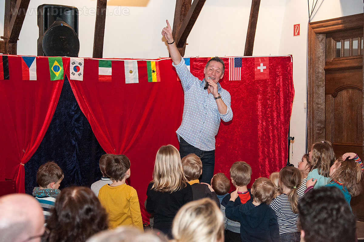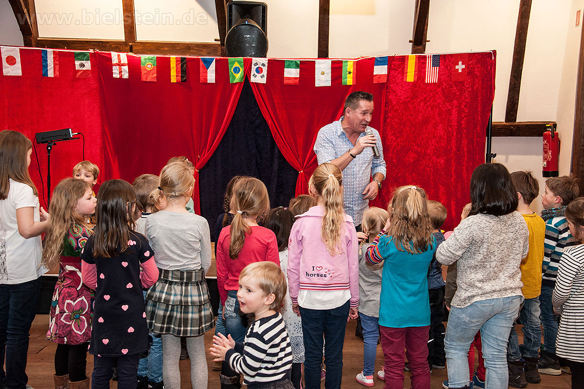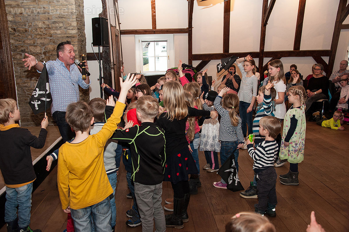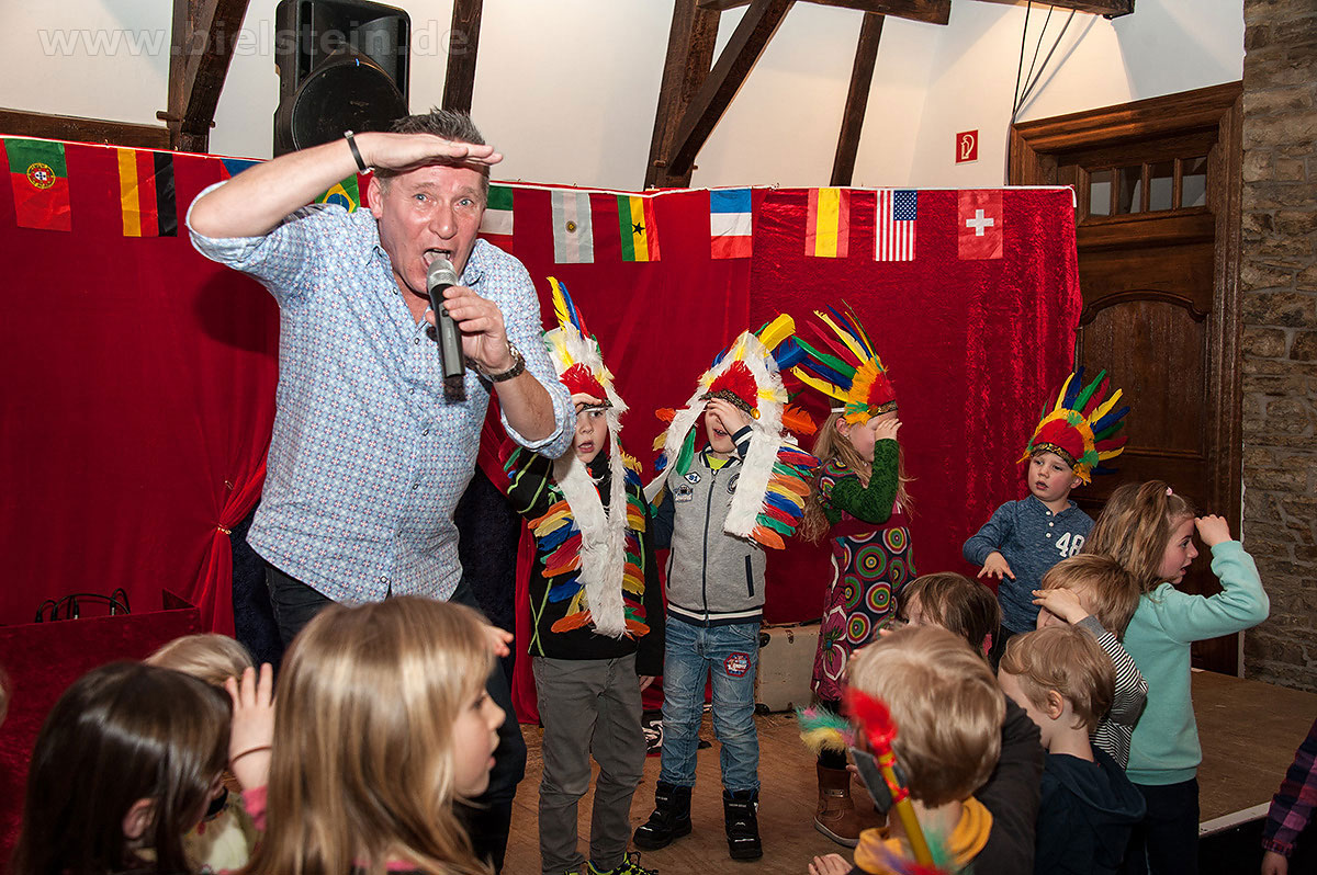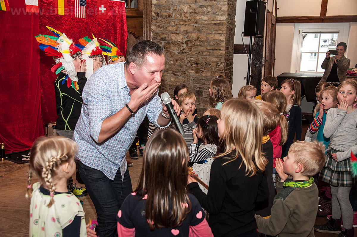 „Grisu“ hieß er und nahm die vielen Kinder – die mit Eltern, Oma und Opa und Freunden zur Veranstaltung „Kultur für Kids“ des Kulturkreises Wiehl gekommen waren – mit auf eine musikalische Weltreise. Vor dem roten Vorhang hingen passend dazu bunte Länderfahnen. Zu Samba-Rhythmen ging es nach Südamerika. Dazu „oh, oh“ singende und dabei hüpfende kleine Gäste. Sänger und Entertainer Ralf Dreßen wusste genau, wie er die Horde mitreißen konnte. „Wer möchte einen Cowboyhut?“ fragte er und natürlich meldeten sich da gleich einige Jungen und Mädchen. Er hatte natürlich gleich mehrere dabei. Schnell wurde noch ein bisschen der Text eingeübt und schon konnte die Begleitmusik vom Band starten. „Ich möchte gern ein Cowboy sein“, sang Dreßen und hatte seinen großen Kinderchor dazu. Auch bei „Wir haben keine Angst“ sangen sie begeistert mit. „Alles im Griff auf dem Piratenschiff“ hatten sie gemeinsam mit Dreßen und mit Piratenflaggen, schwarzen und roten Piratenkopfbedeckungen und kleinen Fernrohren. Und wo vorher Cowboys im Kreis hüpften, spähten die Indianer mit buntem Kopfschmuck zur Musik durch den Saal. Liedermacher Ralf Dreßen hatte zu jedem Lied einen speziellen Bewegungsablauf und einfache Texte zum Mitsingen. Der Rheinländer wohnt seit zweieinhalb Jahren im Oberbergischen – der Liebe wegen. Zudem hat er seine Liebe zur kölschen Musik mitgebracht und zum Abschluss sollte jedes Kind noch einen Erwachsenen mit auf die Tanzfläche holen. Gemeinsam schunkelten sie im großen Kreis zu „Mer zwei für immer“. Ein Lied aus der Feder von Dreßen – seit mehr als 15 Jahren komponiert der Rheinländer Lieder für Kinder und auch für Erwachsene. Über 50 Lieder allein für die Kinder. Und die nahmen das „Mitmachkonzert“ auch wörtlich. Seine Musikshow für Kindergarten- und Grundschulkinder kam super an. Damit ist er auch in vielen Kitas und Grundschulen unterwegs. Zur nächsten „Kultur für Kids“-Veranstaltung kommt das WODO Puppenspiel mit „Briefe von Felix“ am 18.04.2018 ins Burghaus.