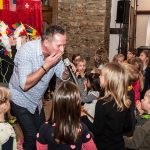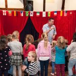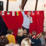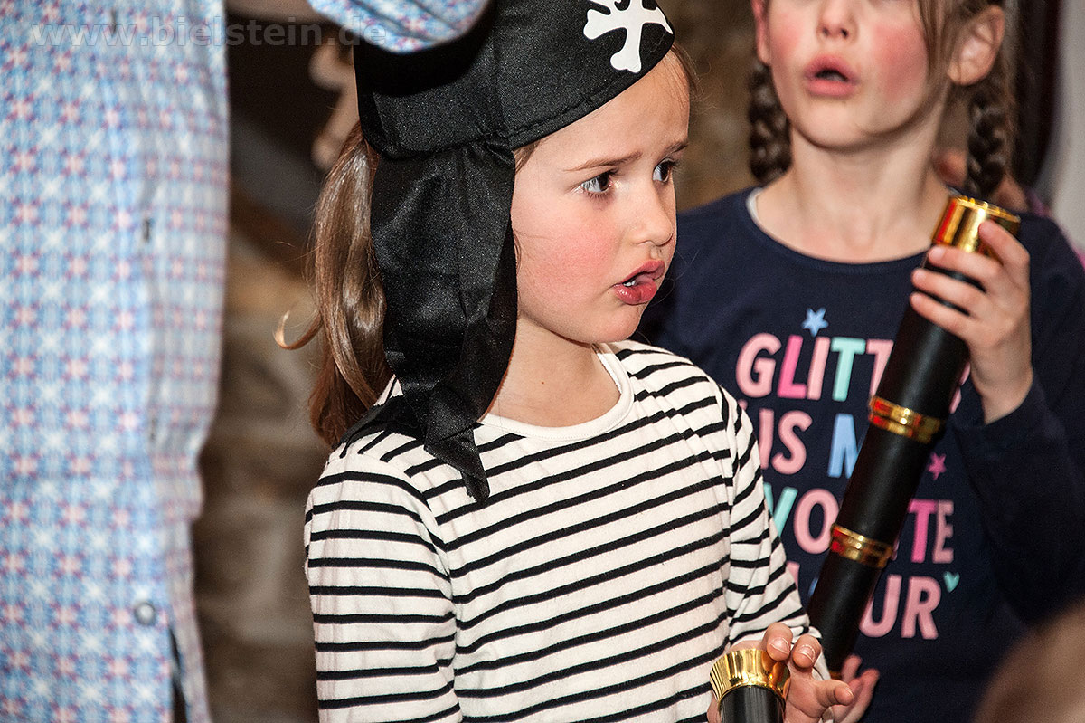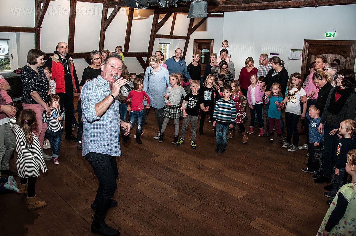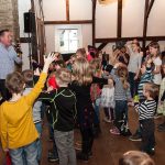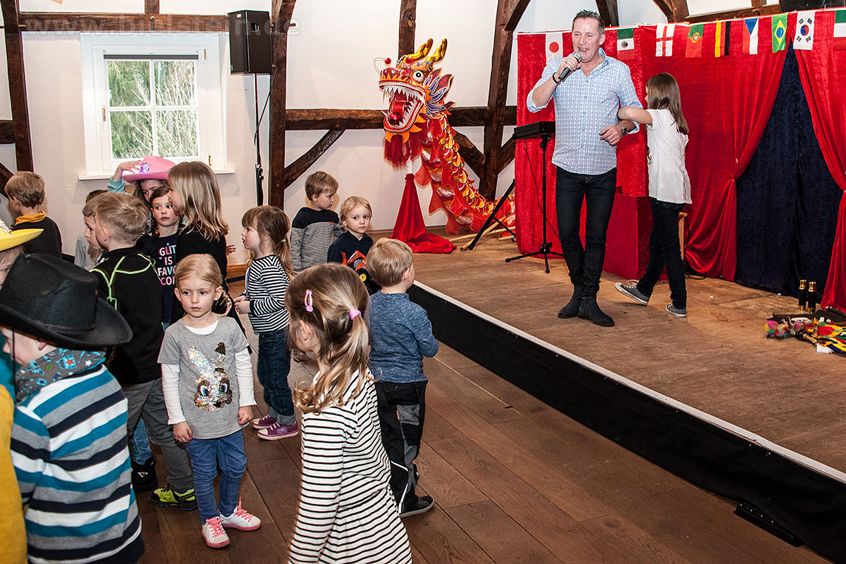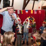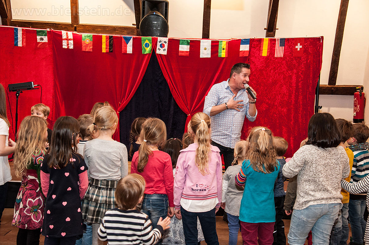 „Grisu“ hieß er und nahm die vielen Kinder – die mit Eltern, Oma und Opa und Freunden zur Veranstaltung „Kultur für Kids“ des Kulturkreises Wiehl gekommen waren – mit auf eine musikalische Weltreise. Vor dem roten Vorhang hingen passend dazu bunte Länderfahnen. Zu Samba-Rhythmen ging es nach Südamerika. Dazu „oh, oh“ singende und dabei hüpfende kleine Gäste. Sänger und Entertainer Ralf Dreßen wusste genau, wie er die Horde mitreißen konnte. „Wer möchte einen Cowboyhut?“ fragte er und natürlich meldeten sich da gleich einige Jungen und Mädchen. Er hatte natürlich gleich mehrere dabei. Schnell wurde noch ein bisschen der Text eingeübt und schon konnte die Begleitmusik vom Band starten. „Ich möchte gern ein Cowboy sein“, sang Dreßen und hatte seinen großen Kinderchor dazu. Auch bei „Wir haben keine Angst“ sangen sie begeistert mit. „Alles im Griff auf dem Piratenschiff“ hatten sie gemeinsam mit Dreßen und mit Piratenflaggen, schwarzen und roten Piratenkopfbedeckungen und kleinen Fernrohren. Und wo vorher Cowboys im Kreis hüpften, spähten die Indianer mit buntem Kopfschmuck zur Musik durch den Saal. Liedermacher Ralf Dreßen hatte zu jedem Lied einen speziellen Bewegungsablauf und einfache Texte zum Mitsingen. Der Rheinländer wohnt seit zweieinhalb Jahren im Oberbergischen – der Liebe wegen. Zudem hat er seine Liebe zur kölschen Musik mitgebracht und zum Abschluss sollte jedes Kind noch einen Erwachsenen mit auf die Tanzfläche holen. Gemeinsam schunkelten sie im großen Kreis zu „Mer zwei für immer“. Ein Lied aus der Feder von Dreßen – seit mehr als 15 Jahren komponiert der Rheinländer Lieder für Kinder und auch für Erwachsene. Über 50 Lieder allein für die Kinder. Und die nahmen das „Mitmachkonzert“ auch wörtlich. Seine Musikshow für Kindergarten- und Grundschulkinder kam super an. Damit ist er auch in vielen Kitas und Grundschulen unterwegs. Zur nächsten „Kultur für Kids“-Veranstaltung kommt das WODO Puppenspiel mit „Briefe von Felix“ am 18.04.2018 ins Burghaus.
