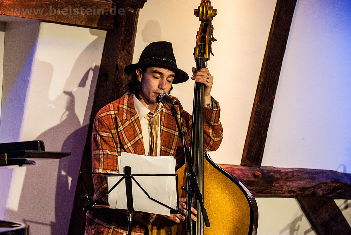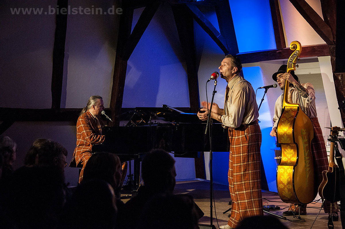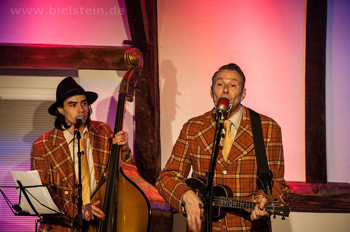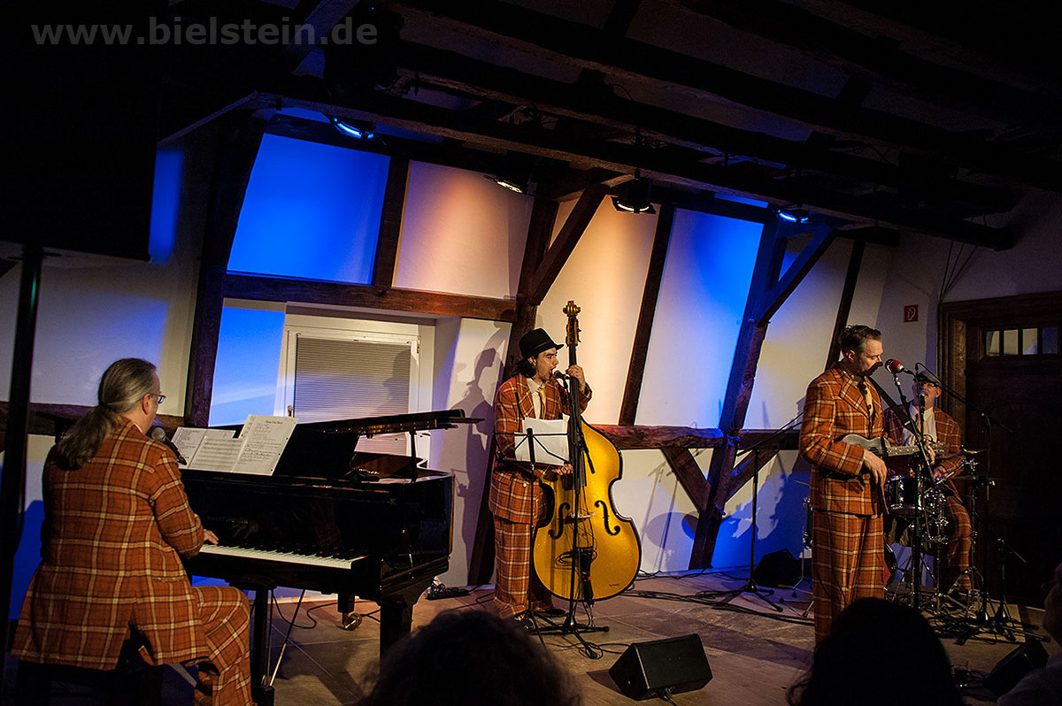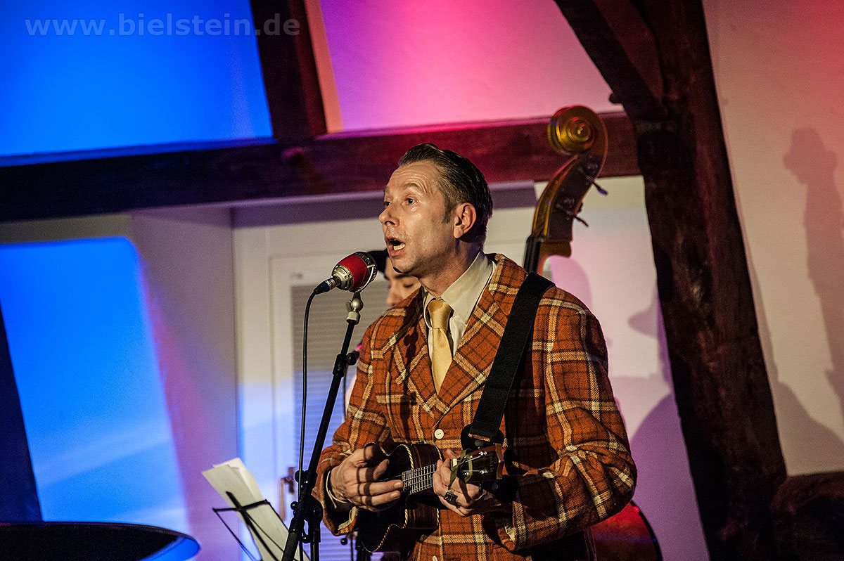 Sänger und Ukulele-Spieler Maarten Hoogenboom erklärte: „Wir spielen ihnen Lieder aus unserer Jugendzeit – wir sind nämlich viel älter als wir aussehen!“. Nat King Coles „Straighten Up And Fly Right“ kam ebenso gut an wie das 1938 durch die Andrew Sisters bekannt gewordene Stück „Bei mir bist Du schön“. Sogar einen Walzer – frei nach Dean Martin – gab es an diesem Abend: „That‘s Amore“ verleitete zum Schunkeln im Dreiviertel-Takt. „Blue Moon“ interpretierten schon Ella Fitzgerald und Elvis Presley – in Bielstein der „Swing Cat Club“. Den „Just A Gigolo“ sang Pianist Christian Weichert, aber auch Schlagzeuger Timon Ruhemann und Kris Sinister am Schlagbass stimmten gesanglich immer wieder mit ein. Sänger Maarten Hoogenboom wies dann öfters darauf hin, dass dies ein „Best of Swing Cat Club“-Abend sei und sie auch ihre Tonträger dazu dabeihätten. Die nahmen auch einige der Gäste mit nach Hause. Sehr tanzbar ist ihre Musik, auch wenn im Burghaus nur auf den Stühlen gewippt wurde. Hoogenboom übersetzte für die Bielsteiner auch den Titel „In The Mood“ – das bedeute „Hallo schönes Fräulein haben sie für mich Zeit“. Und die Zeit verging wie im Flug mit der Swing-Band, bis sie gemeinsam mit dem Publikum ein „Oh Diana“ sangen. Der Abend mit viel Swing stimmte schon auf die Wiehler Jazztage bzw. die „Seven Nights Of Jazz“ ein, die vom 3. Bis 10. Mai 2018 stattfinden.