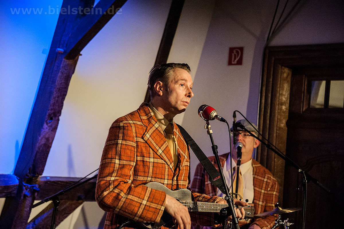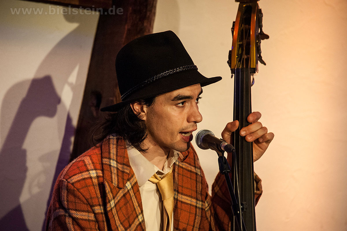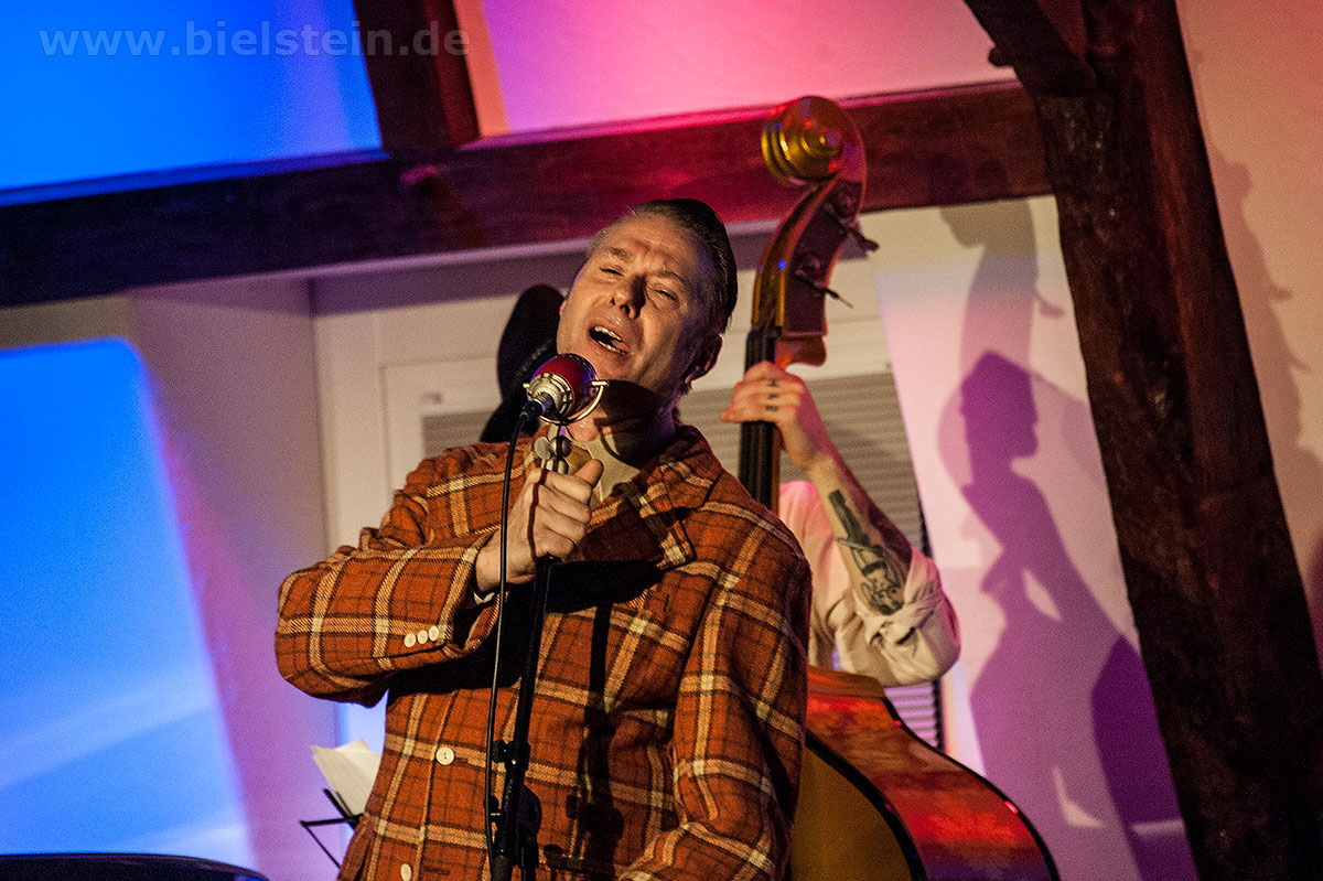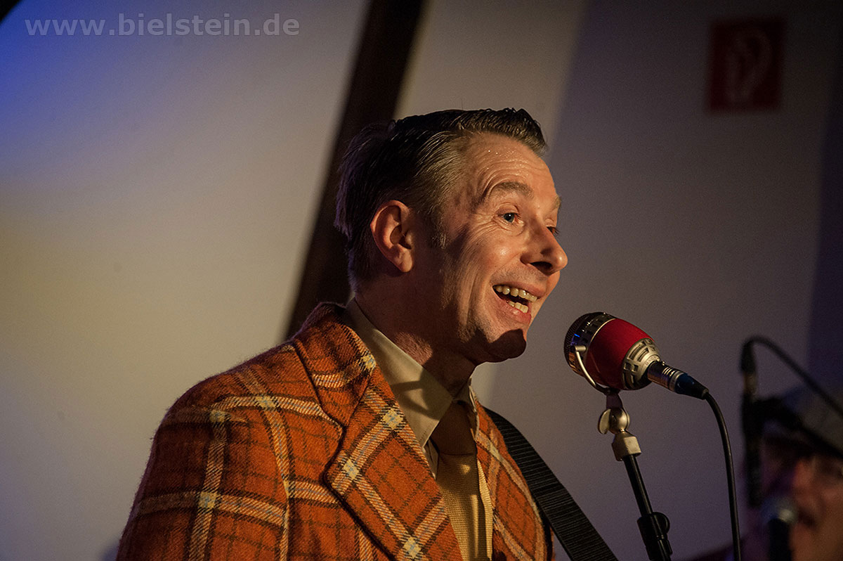Sänger und Ukulele-Spieler Maarten Hoogenboom erklärte: „Wir spielen ihnen Lieder aus unserer Jugendzeit – wir sind nämlich viel älter als wir aussehen!“. Nat King Coles „Straighten Up And Fly Right“ kam ebenso gut an wie das 1938 durch die Andrew Sisters bekannt gewordene Stück „Bei mir bist Du schön“. Sogar einen Walzer – frei nach Dean Martin – gab es an diesem Abend: „That‘s Amore“ verleitete zum Schunkeln im Dreiviertel-Takt. „Blue Moon“ interpretierten schon Ella Fitzgerald und Elvis Presley – in Bielstein der „Swing Cat Club“. Den „Just A Gigolo“ sang Pianist Christian Weichert, aber auch Schlagzeuger Timon Ruhemann und Kris Sinister am Schlagbass stimmten gesanglich immer wieder mit ein. Sänger Maarten Hoogenboom wies dann öfters darauf hin, dass dies ein „Best of Swing Cat Club“-Abend sei und sie auch ihre Tonträger dazu dabeihätten. Die nahmen auch einige der Gäste mit nach Hause. Sehr tanzbar ist ihre Musik, auch wenn im Burghaus nur auf den Stühlen gewippt wurde. Hoogenboom übersetzte für die Bielsteiner auch den Titel „In The Mood“ – das bedeute „Hallo schönes Fräulein haben sie für mich Zeit“. Und die Zeit verging wie im Flug mit der Swing-Band, bis sie gemeinsam mit dem Publikum ein „Oh Diana“ sangen. Der Abend mit viel Swing stimmte schon auf die Wiehler Jazztage bzw. die „Seven Nights Of Jazz“ ein, die vom 3. Bis 10. Mai 2018 stattfinden.