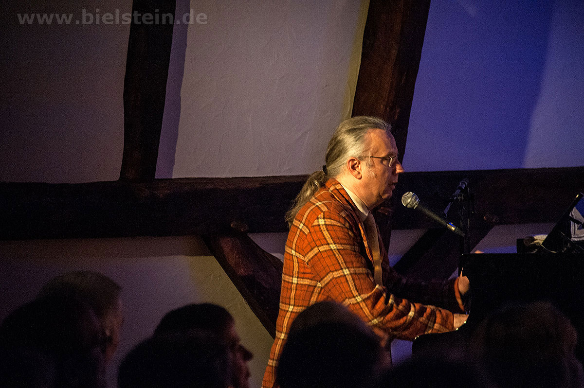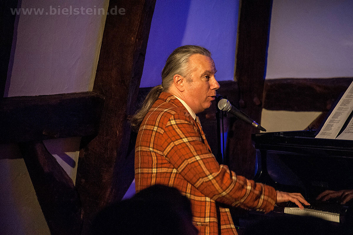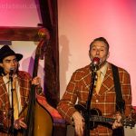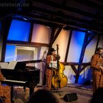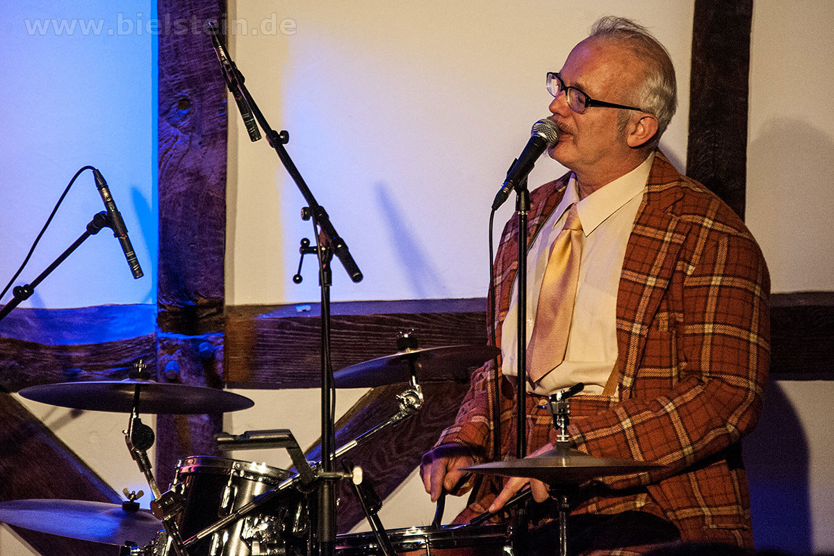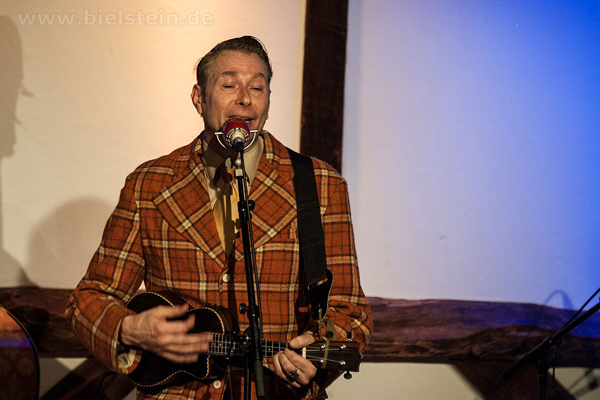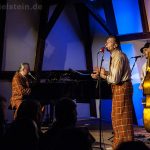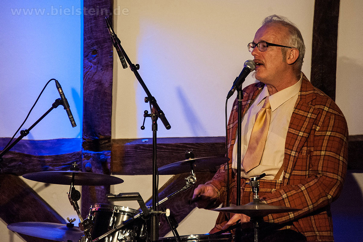 Sänger und Ukulele-Spieler Maarten Hoogenboom erklärte: „Wir spielen ihnen Lieder aus unserer Jugendzeit – wir sind nämlich viel älter als wir aussehen!“. Nat King Coles „Straighten Up And Fly Right“ kam ebenso gut an wie das 1938 durch die Andrew Sisters bekannt gewordene Stück „Bei mir bist Du schön“. Sogar einen Walzer – frei nach Dean Martin – gab es an diesem Abend: „That‘s Amore“ verleitete zum Schunkeln im Dreiviertel-Takt. „Blue Moon“ interpretierten schon Ella Fitzgerald und Elvis Presley – in Bielstein der „Swing Cat Club“. Den „Just A Gigolo“ sang Pianist Christian Weichert, aber auch Schlagzeuger Timon Ruhemann und Kris Sinister am Schlagbass stimmten gesanglich immer wieder mit ein. Sänger Maarten Hoogenboom wies dann öfters darauf hin, dass dies ein „Best of Swing Cat Club“-Abend sei und sie auch ihre Tonträger dazu dabeihätten. Die nahmen auch einige der Gäste mit nach Hause. Sehr tanzbar ist ihre Musik, auch wenn im Burghaus nur auf den Stühlen gewippt wurde. Hoogenboom übersetzte für die Bielsteiner auch den Titel „In The Mood“ – das bedeute „Hallo schönes Fräulein haben sie für mich Zeit“. Und die Zeit verging wie im Flug mit der Swing-Band, bis sie gemeinsam mit dem Publikum ein „Oh Diana“ sangen. Der Abend mit viel Swing stimmte schon auf die Wiehler Jazztage bzw. die „Seven Nights Of Jazz“ ein, die vom 3. Bis 10. Mai 2018 stattfinden.