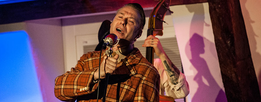 Vier Herren in orange-braun-karierten Anzügen auf der Bühne im Burghaus Bielstein? Im schicken Zwirn swingt und singt der „Swing Cat Club“ von gebrochenen Herzen und den Tücken des Lebens und holte die alten Schlager der Swing-Ära hervor.