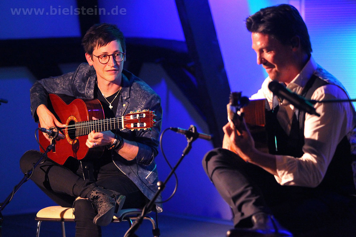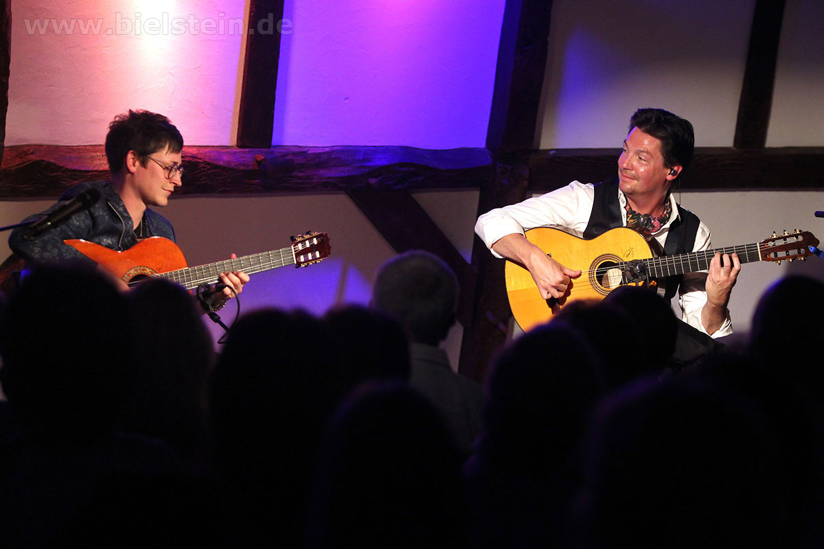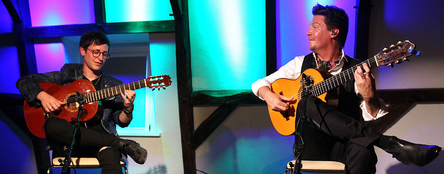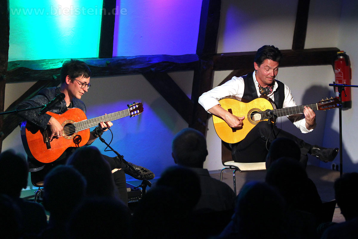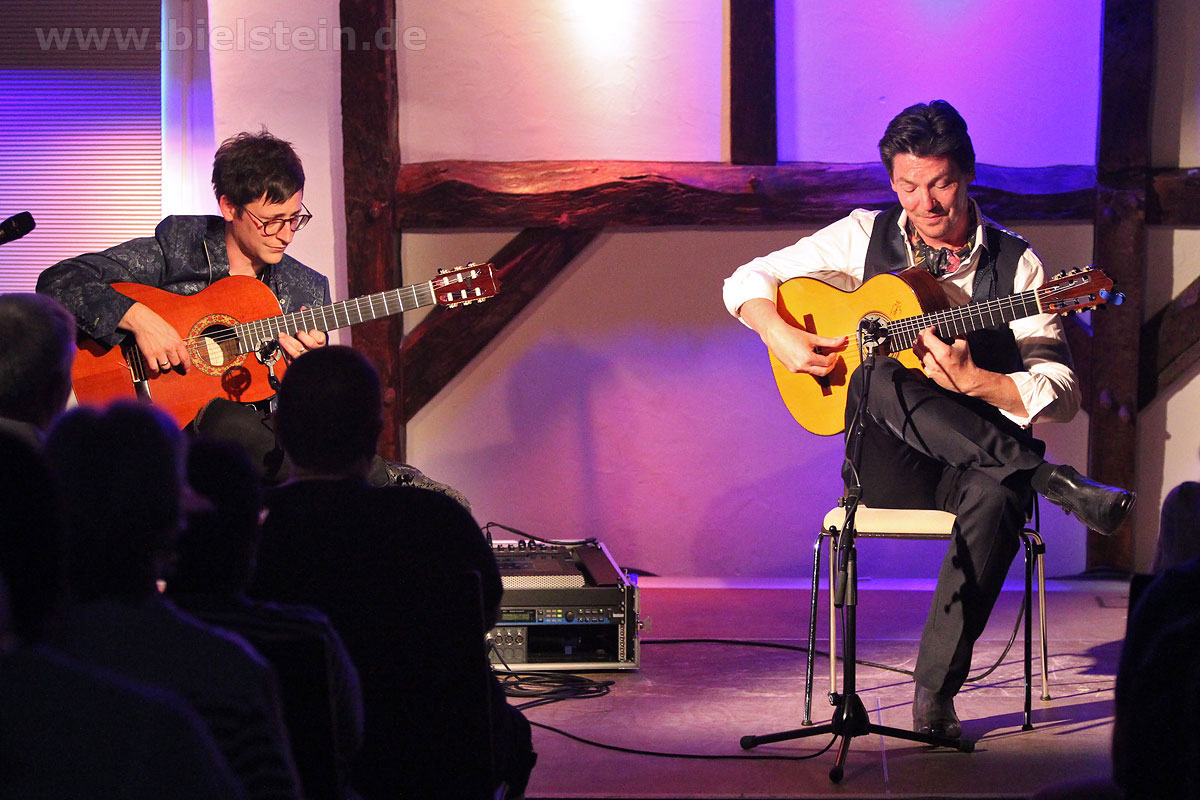 Beide sind seit frühester Kindheit fasziniert von der Flamenco-Gitarre und was diese genau ausmacht, versuchen sie immer noch herauszufinden. Dazu reisen sie viel und verfolgen den Weg der Flamenco-Gitarre sozusagen rückwärts. Eine Reise ging in die arabischen Länder und bei den Beduinen entstand dann „Arabian Nights“, mit dem sie den Zauber einer arabischen Nacht in perlende Klänge umsetzten. Jan Pascal und Alexander Kilian sind zwei preisgekrönte Flamenco-Nuevo-Gitarristen aus dem Süden Deutschlands. Gemeinsam spielen sie atemberaubend virtuose, hoch emotionale und reizvoll arrangierte Musik. Ihr „Dance of Joy“ wird zu einem Freudentanz und entführt die Zuhörer ein besonderes Lebensgefühl. Da wird alles andere nebensächlich, weil die beiden mit Gitarrenspiel auf aller höchstem Niveau, gepaart mit viel Charisma, hineinnehmen in ihre Musik. 2014 waren sie bereits im Burghaus Bielstein und überzeugten – wie an dem vierten Abend von „Seven Nights of Jazz“ – durch die pure Konzentration auf ihre Musik gepaart mit einer besonderen Leichtigkeit.