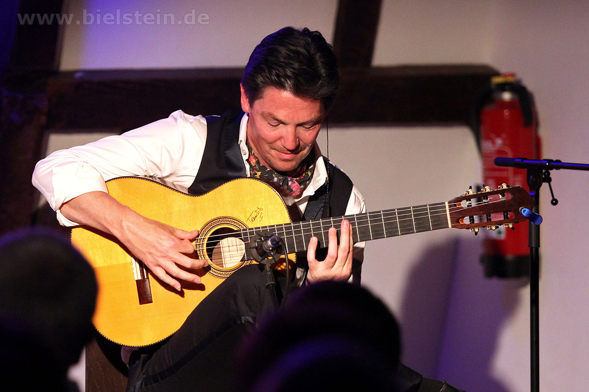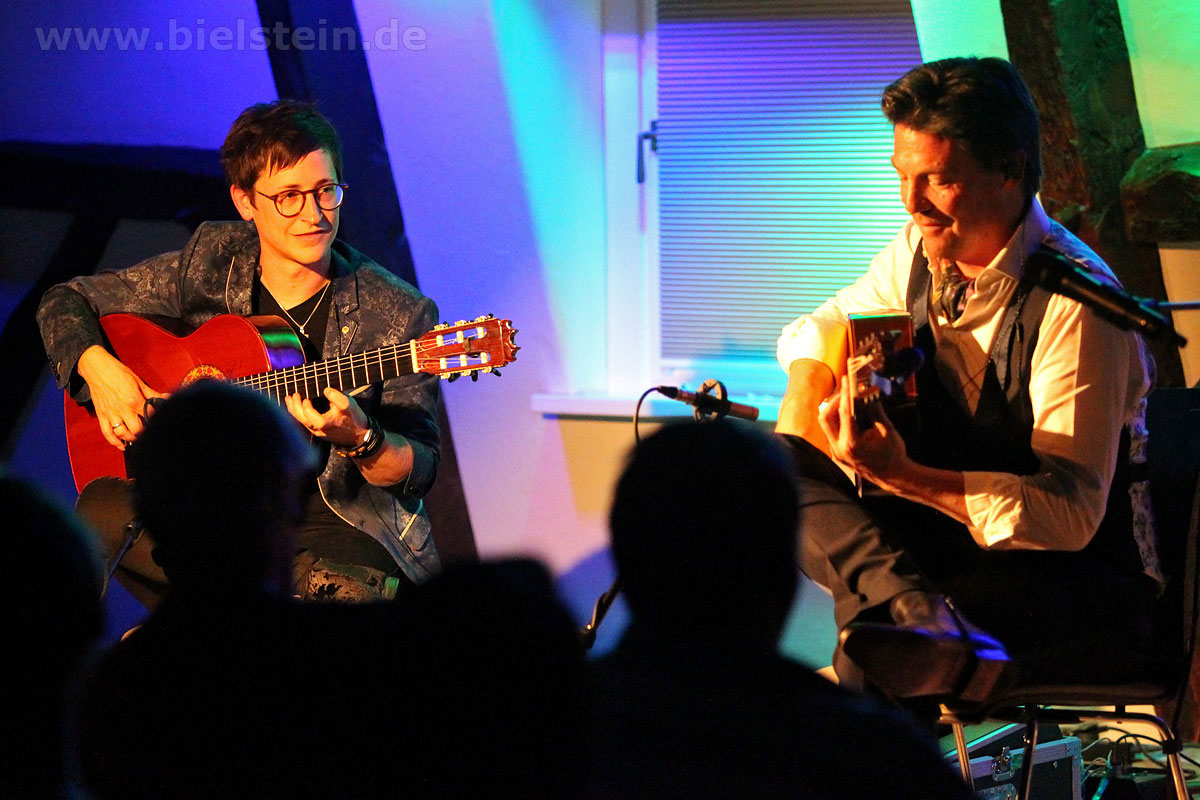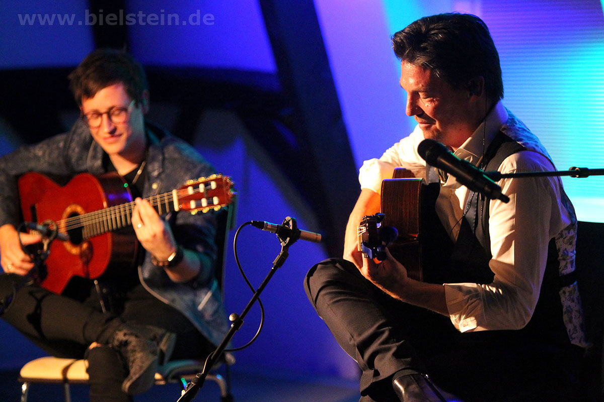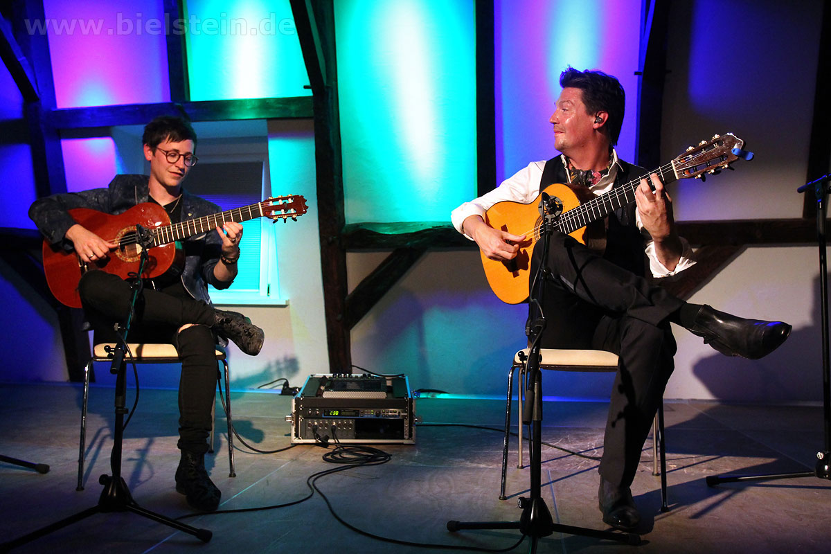 Beide sind seit frühester Kindheit fasziniert von der Flamenco-Gitarre und was diese genau ausmacht, versuchen sie immer noch herauszufinden. Dazu reisen sie viel und verfolgen den Weg der Flamenco-Gitarre sozusagen rückwärts. Eine Reise ging in die arabischen Länder und bei den Beduinen entstand dann „Arabian Nights“, mit dem sie den Zauber einer arabischen Nacht in perlende Klänge umsetzten. Jan Pascal und Alexander Kilian sind zwei preisgekrönte Flamenco-Nuevo-Gitarristen aus dem Süden Deutschlands. Gemeinsam spielen sie atemberaubend virtuose, hoch emotionale und reizvoll arrangierte Musik. Ihr „Dance of Joy“ wird zu einem Freudentanz und entführt die Zuhörer ein besonderes Lebensgefühl. Da wird alles andere nebensächlich, weil die beiden mit Gitarrenspiel auf aller höchstem Niveau, gepaart mit viel Charisma, hineinnehmen in ihre Musik. 2014 waren sie bereits im Burghaus Bielstein und überzeugten – wie an dem vierten Abend von „Seven Nights of Jazz“ – durch die pure Konzentration auf ihre Musik gepaart mit einer besonderen Leichtigkeit.