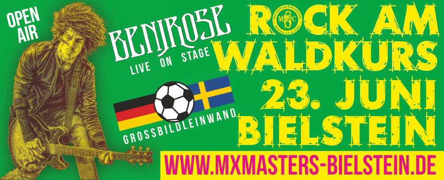 Am Rennsamstag des ADAC MX Masters auf dem Bielsteiner Waldkurs ist, auch wenn die Motoren am 23. Juni bereits ruhen, für Spaß, Spannung und Action gesorgt: Gemeinsam wird die deutsche Fußball-Nationalmannschaft angefeuert, deren WM-Spiel gegen Schweden um 20 Uhr live auf Großbildleinwand beginnt. Im Anschluß betreten dann BenjRose die Bühne an der legendären Rennstrecke im Uelpetal.
