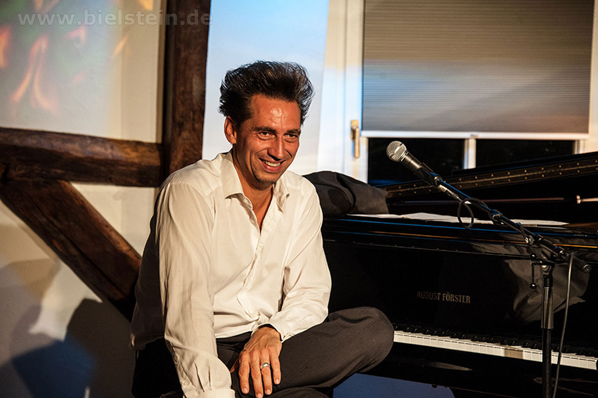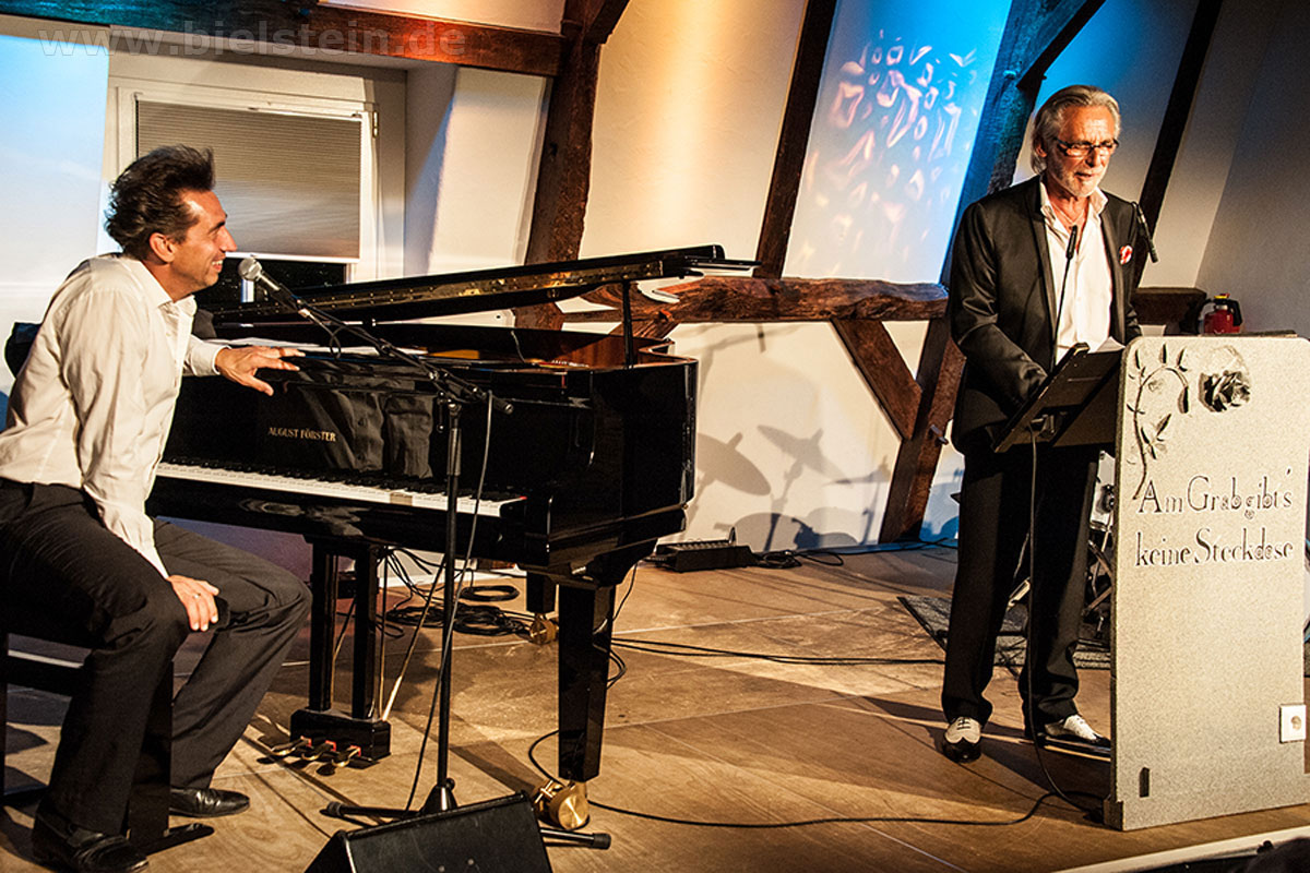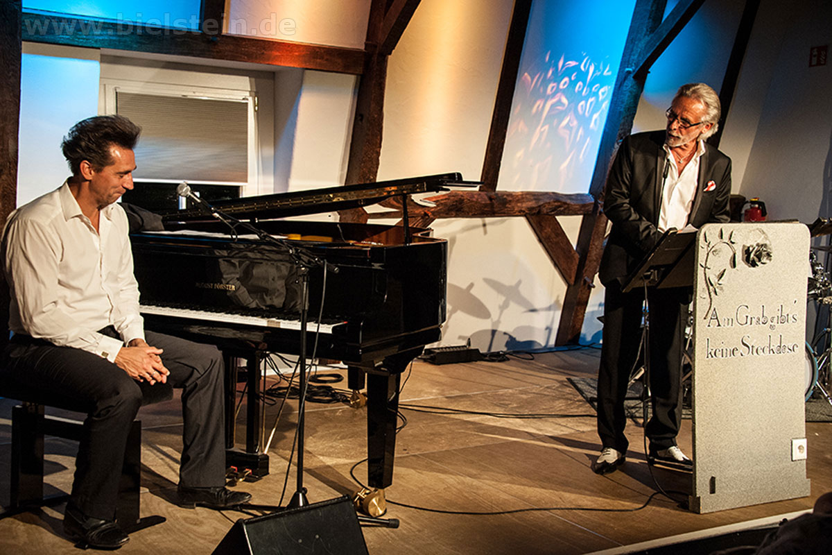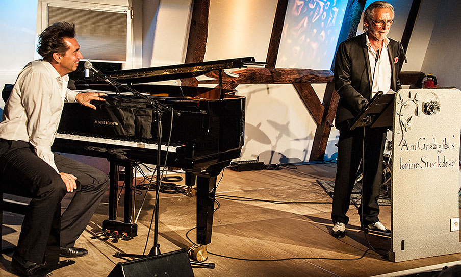 Gemeinsam mit Entertainer, Küchenprofi, Autor und Nahrungsmittelexperte Tobias Sudhoff gestaltete Willy Ketzer einen musikalischen Lese-Abend. „Let it be“ von den Beatles mit Ketzer am Schlagzeug und Sudhoff am Flügel und mit Gesang passend zu den Storys aus der Beatles-Anfangszeit. Nat King Coles „Route 66“, „Papermoon“ und auch Gershwins „Fly me to the moon“ spielten die beiden. Aber auch Stücke von Tobias Sudhoff, wie das „Miss Tagesschau“. Sudhoff betreibt in Münster ein eigenes Restaurant.
