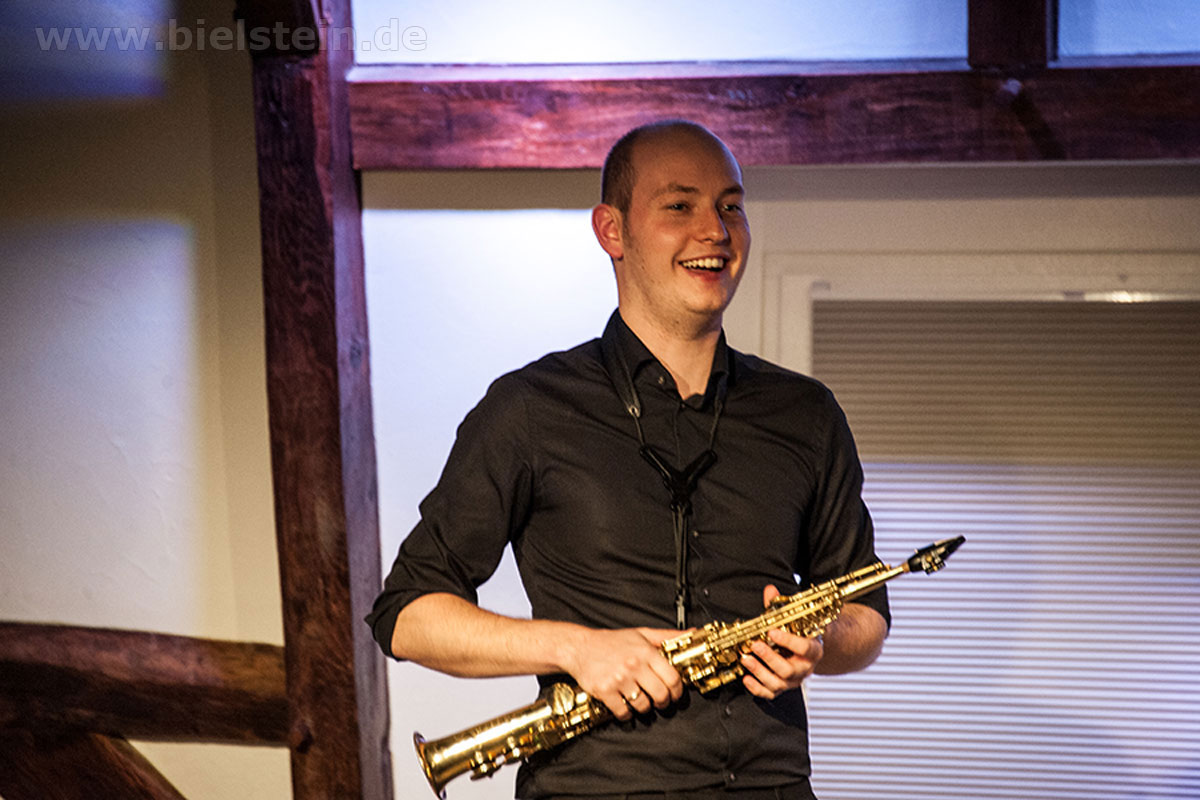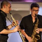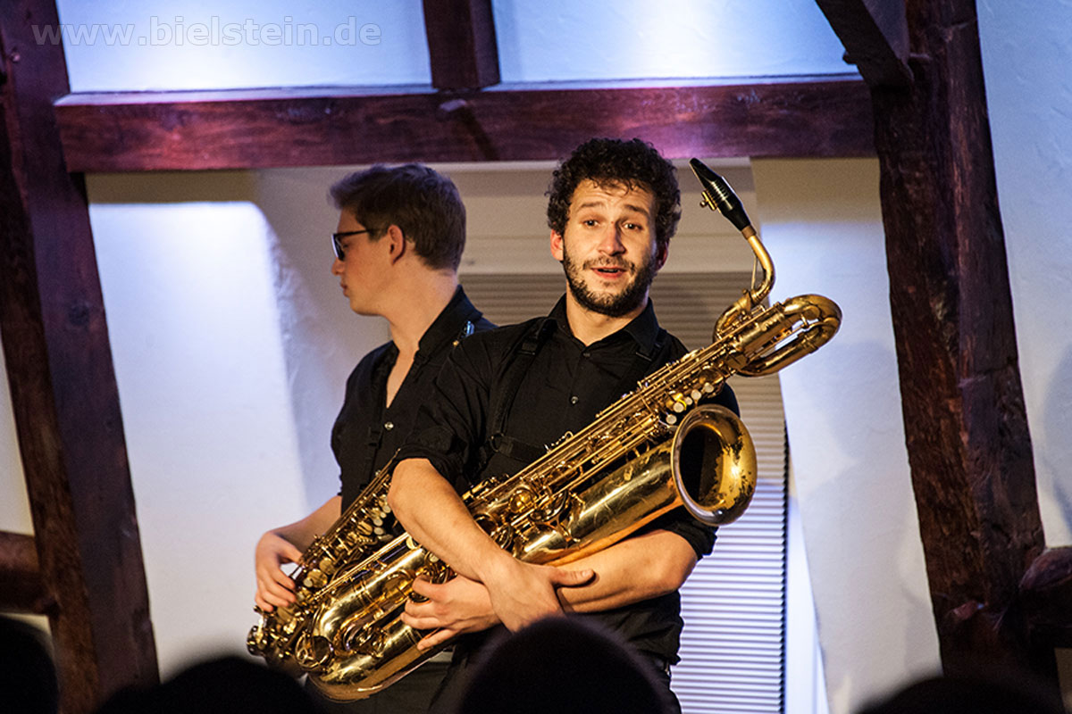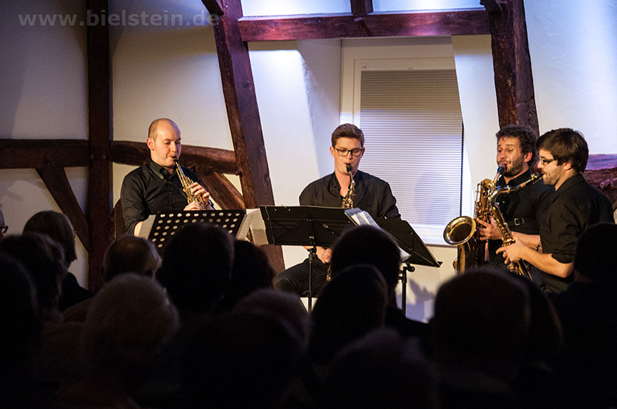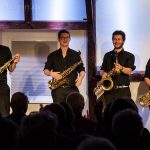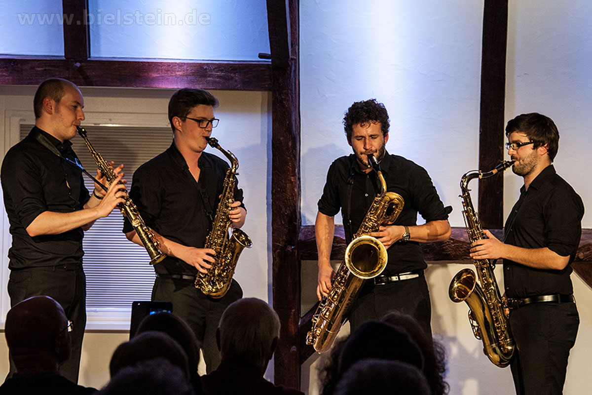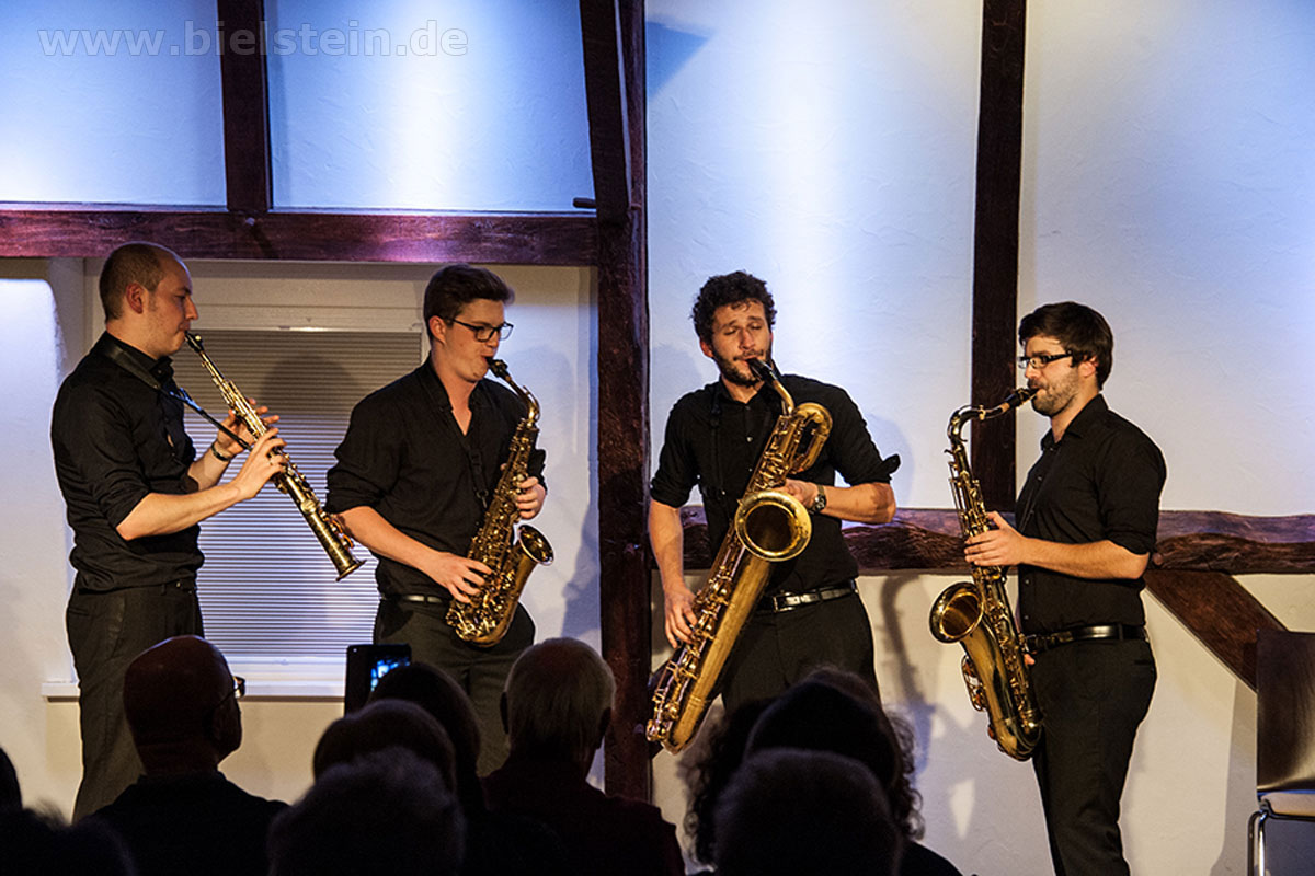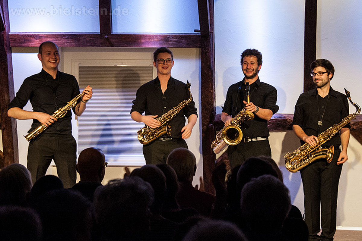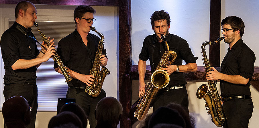 Das sorgte für viel Begeisterung. Zu der Auftragskomposition, die Daniel Alvarado speziell für das Quartett unter dem Titel „Steps (within a step)“ geschrieben hatte, erhielten die Gäste eine kurze Einführung. Denn diese Komposition war gespickt mit vielen Besonderheiten, wie Flagoelette und Rauschetöne oder Slaps. Sicher eine ganz neue Erfahrung für manchen Gast, aber: gewöhnlich kann (fast) jeder. Sehr experimentell und eine hohe Kunst, so etwas auf diesen Holzblasinstrumenten spielen zu können. Es ist anders, es ist außergewöhnlich. Aber gerade solch herausragenden jungen Künstlern – die nicht umsonst diverse Stipendien erhalten haben – sollte diese Experimentierfreudigkeit hoch anerkannt werden. Es ist eine Herausforderung für die Musiker – und für das Publikum. Leider zollten nicht alle Gäste dies mit Respekt – ein lautes „Das ist doch keine Musik“ störte da doch genauso wie weiteres kommentierendes Gemurmel. Aber der Großteil des Publikums ließ sich auf die besonders avancierte Komposition ein, die Lukas Stappenbeck (Sopransaxophon), Anže Rupnik (Altsaxophon), Adrian Durm (Tenorsaxophon) und Benjamin Reichel (Baritonsaxophon) zu Gehör brachten.