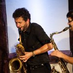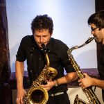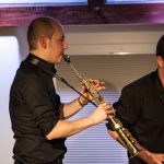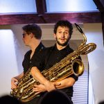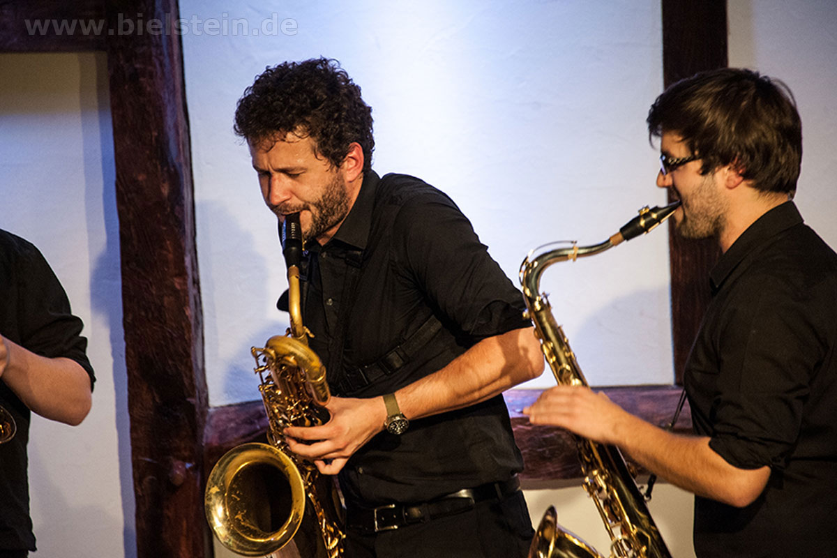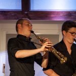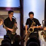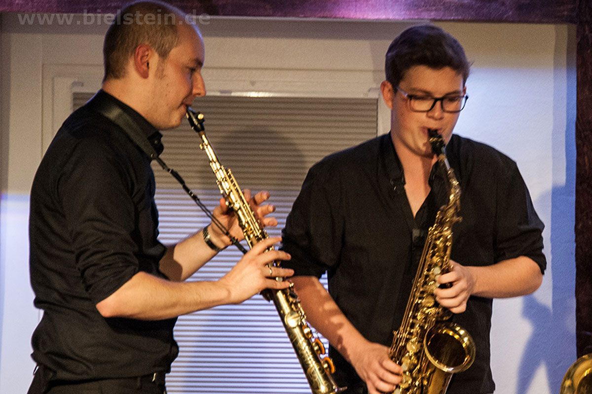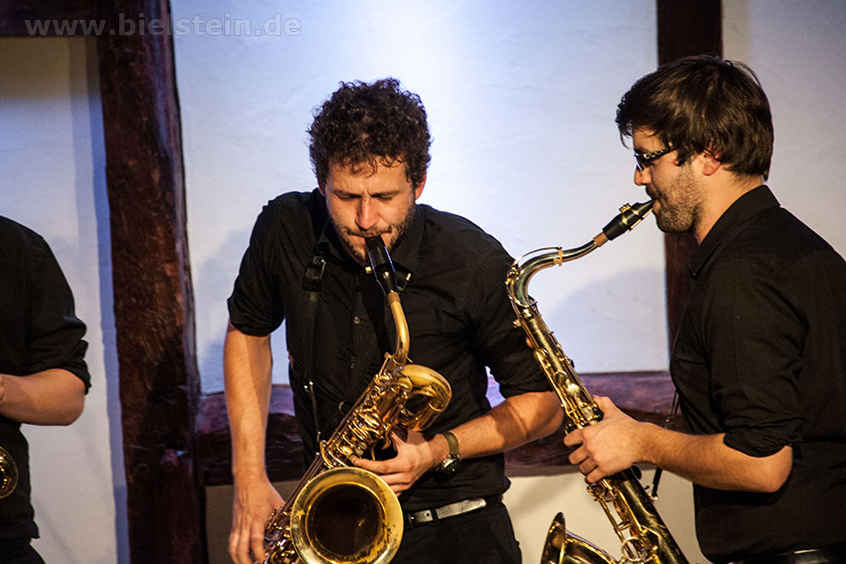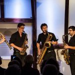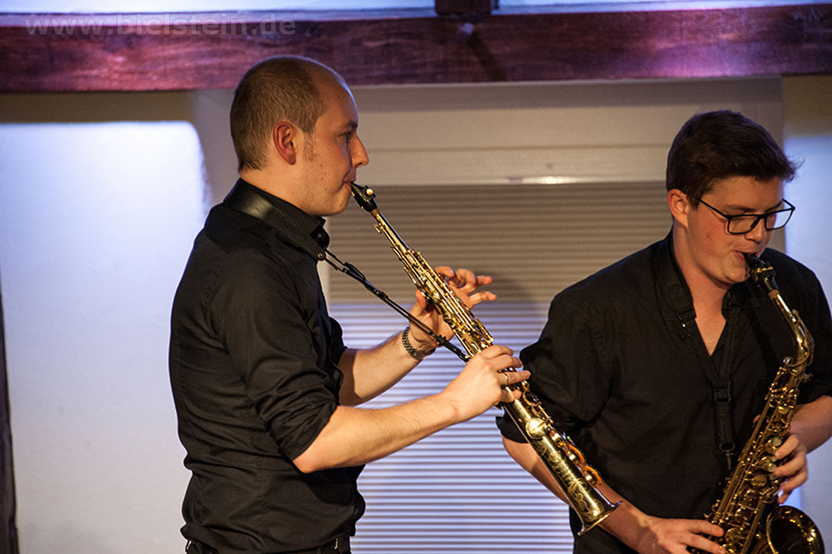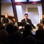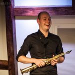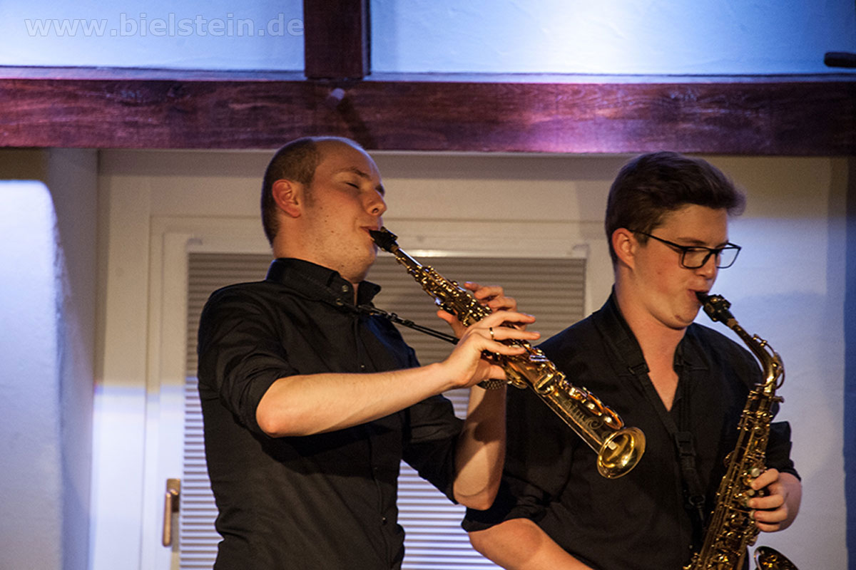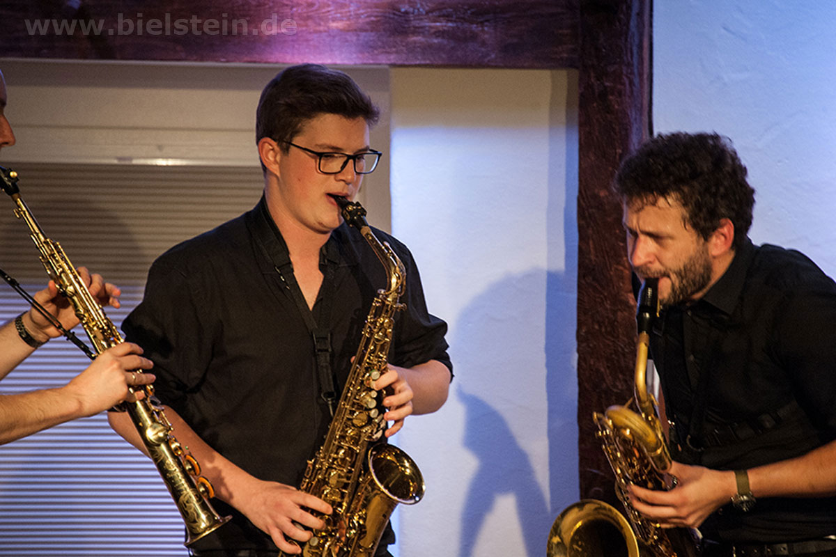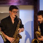 Das sorgte für viel Begeisterung. Zu der Auftragskomposition, die Daniel Alvarado speziell für das Quartett unter dem Titel „Steps (within a step)“ geschrieben hatte, erhielten die Gäste eine kurze Einführung. Denn diese Komposition war gespickt mit vielen Besonderheiten, wie Flagoelette und Rauschetöne oder Slaps. Sicher eine ganz neue Erfahrung für manchen Gast, aber: gewöhnlich kann (fast) jeder. Sehr experimentell und eine hohe Kunst, so etwas auf diesen Holzblasinstrumenten spielen zu können. Es ist anders, es ist außergewöhnlich. Aber gerade solch herausragenden jungen Künstlern – die nicht umsonst diverse Stipendien erhalten haben – sollte diese Experimentierfreudigkeit hoch anerkannt werden. Es ist eine Herausforderung für die Musiker – und für das Publikum. Leider zollten nicht alle Gäste dies mit Respekt – ein lautes „Das ist doch keine Musik“ störte da doch genauso wie weiteres kommentierendes Gemurmel. Aber der Großteil des Publikums ließ sich auf die besonders avancierte Komposition ein, die Lukas Stappenbeck (Sopransaxophon), Anže Rupnik (Altsaxophon), Adrian Durm (Tenorsaxophon) und Benjamin Reichel (Baritonsaxophon) zu Gehör brachten.