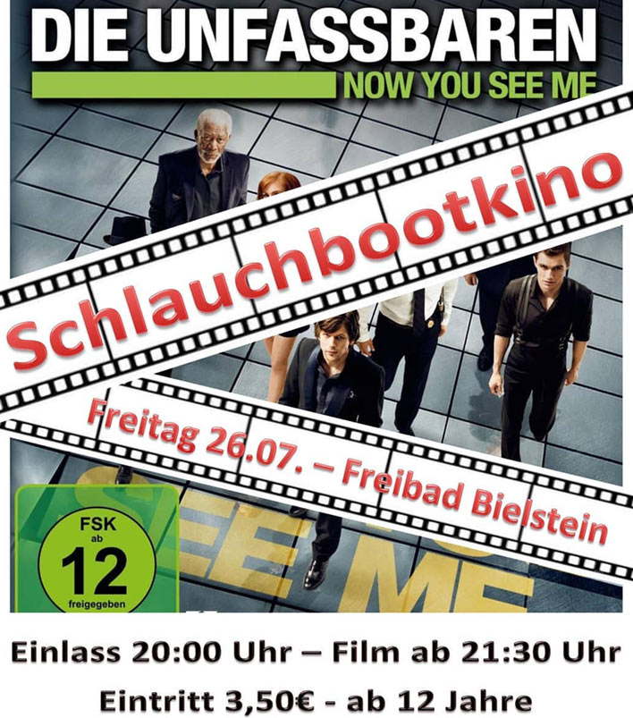 Bietet schon ein Open-Air-Kino ein besonderes Filmerlebnis, wird in diesem Sommer noch einer draufgesetzt. Für alle Teens und Familien ab 12 Jahren öffnet das Bielsteiner Freibad am 26. Juli ab 20:00 Uhr exklusiv seine Tore. Wer mag, kann sich in Badekleidung und mitgebrachten Luftmatratzen, Schlauchbooten oder Schwimmreifen gemütlich auf dem Becken treibend vor der Großbildleinwand tummeln und die Füße im Wasser baumeln lassen. Für Wasserscheue stehen natürlich auch Liegestühle am Beckenrand bereit. Um 21:30 Uhr heißt es dann „Film ab“ für „Die Unfassbaren“, einem packenden Thriller über Magie und Zauberei.