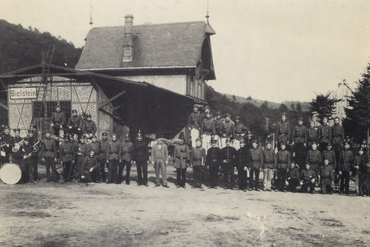 Aufmarsch vor dem neuerbauten Bahnhof Bielstein (In der Mitte - heller Anzug - der damalige Bürgermeister Heinrich Brindöpke)
