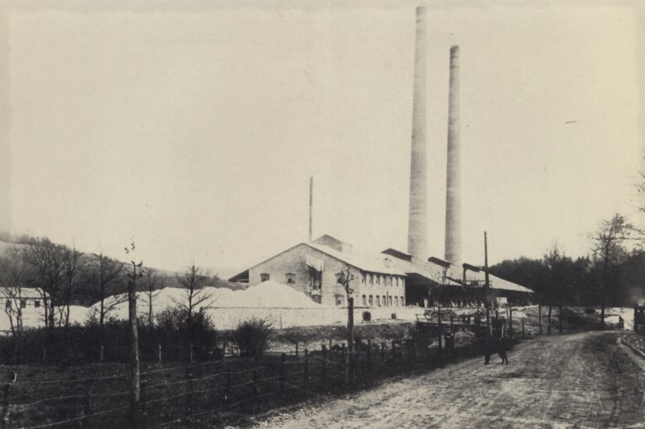 | Die Fabrikgebäude der Vereinigten Wiehltaler Kalk- und Ziegelwerke - gelegen zwischen Bielstein und Weiershagen in Höhe der Firma Kind & Co. Die beiden hohen Schornsteine wurden im Dezember 1933 und Januar 1934 gesprengt. Die Firma selbst hatte schon 1919 die Produktion aufgegeben. |